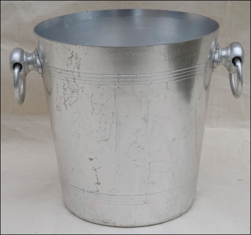 Seau en aluminium publicitaire pour rafraîchir les blancs brut Foussy, vin vif de Touraine, Made in France vers 1970. Bel état d'usage, petit chocs. Hauteur 20,5 cm, diamètre 19,5 cm.