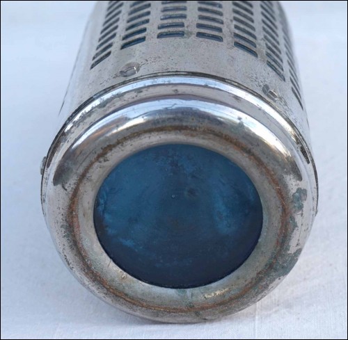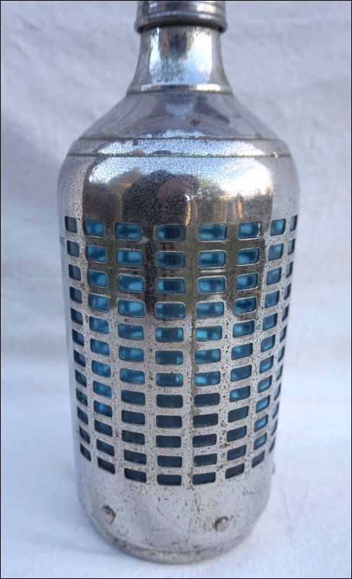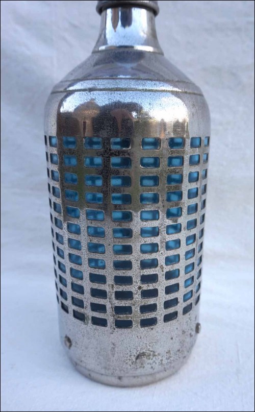 French Art Deco siphon in blue glass with chromium metal case made by AUTO SIPHON 23 rue Emile Dubois in Paris during the 1930's. It'signed . 12 5/8" (32cm height, 4 1/4" (11cm) diameter. Good condition a few small stain on the chromium as shown by the following pictures.