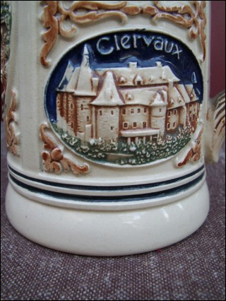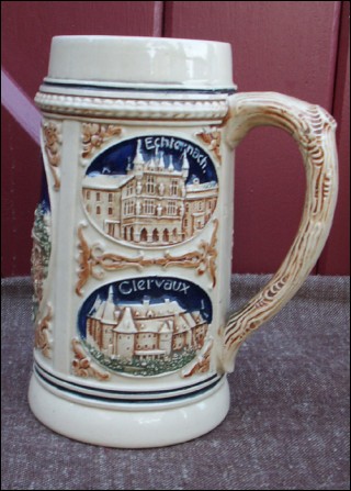 Ceramic beer stein made by the GRM Reinhold Merkelback factory in Germany during the 1940's. The relief decor shows medallions of towns of Luwembourg. Perfect condition. 6" 1/2 high. It's stamped on the back GRM 2118 E.