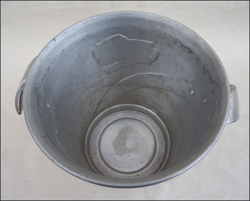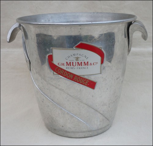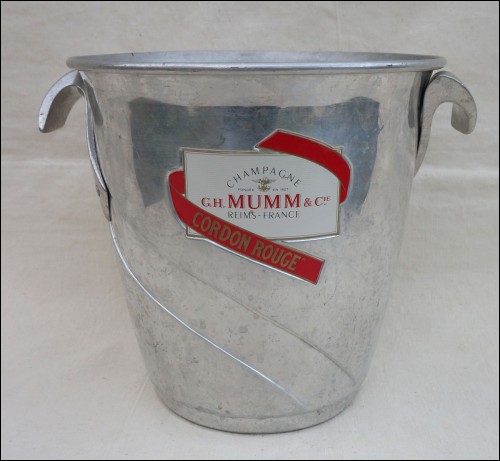 Original french aluminum cooler champagne ice bucket made for the famous Cordon Rouge champagne G.H. Mumm & Cie grower in Reims during the 70's. Good condition. 8 1/4" high 8 1/4" diameter.