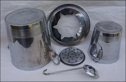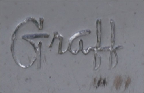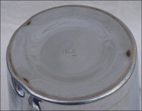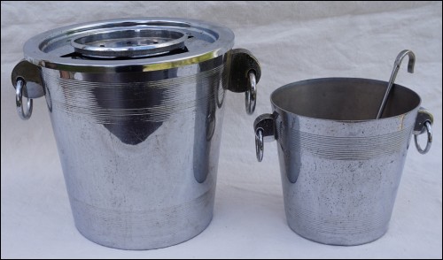 French set of champagne bucket, ice bucket with spoon and caviar server in chrome Graff pattern made by Delaire in Paris. They are stamped on the bottom Graff. They measure for the champagne bucket 7 1/2" (19cm) diameter 7 1/2" (19cm) height and for thee ice bucket 5 1/4" (13.3cm) diameter 5 1/4" (13.3cm) height. Good condition a few tiny bumps and oxydations stains as shown by the following pictures.