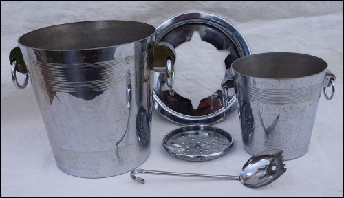 Partie de service Graff pour, caviar, champagne, vin et glaçons en métal argenté au chrome vintage de la maison Delaire. Un seau à rafraîchir le champagne avec un porte caviar et un seau à glace avec sa cuillère. Etat d'usage, quelques bosses et oxydations sur le chrome.