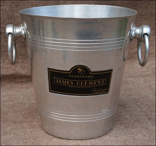 Seau à glace en aluminium pour rafraîchir les champagnes, publicité pour la maison James Clément à Reuil Epernay dans les 70's. Hauteur 20 cm, diamètre 18 cm.
