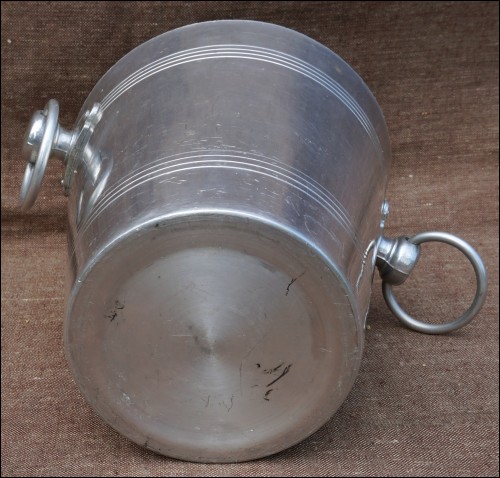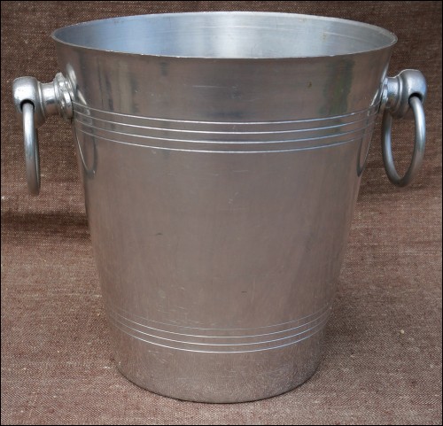 Original aluminum champagne ice bucket cooler made in France for the famous James Clement champagne grower in Reuil Epernay during the 70's. 7 7/8" high 7 1/8" diameter. Good condition.