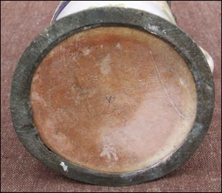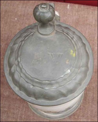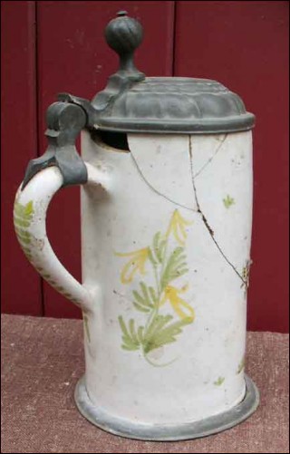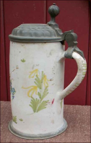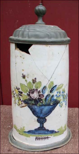Old german faience beer stein with pewter lid and foot ring made by the famous Erfurt factory around 1750. The hand painted decor shows a large flowered vase. The pewter lid is monogramed HV. Unfortunately not in good condition as you can see on the pictures below. 9 1/4" high 4 3/4" diameter.