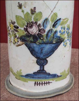 Chope à bière allemande en faïence couverte d'étain, vers 1750. Walzenkrug de la manufacture d'Erfurt à décor au grand feu de vase fleuri, le couvercle est monogramme HV. Vendu dans l'état, à restaurer. Hauteur 23.5 cm, diamètre 11.8 cm.