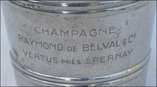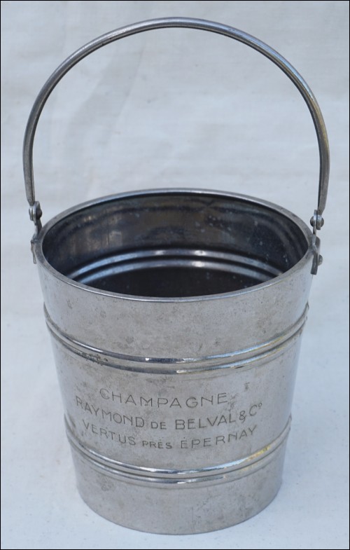 Rare seau publicitaire en inox pour rafraîchir les bouteilles individuelles de champagne Raymond de Belval & Cie à Vertus près d'Epernay, milieu XXème siècle. Bel état d'usage. Hauteur sans anse 13,5 cm, diamètre 13 cm.