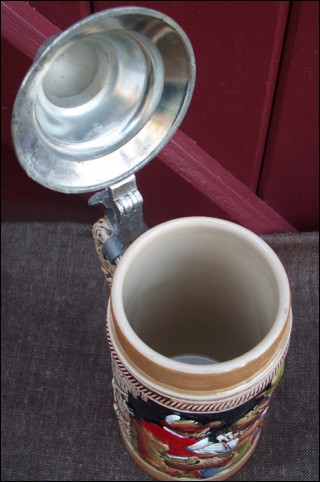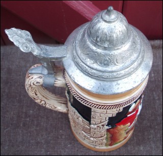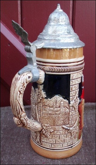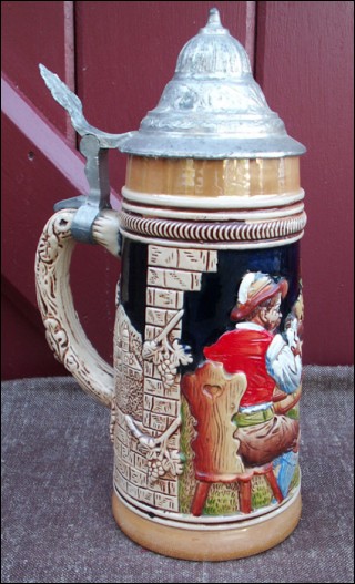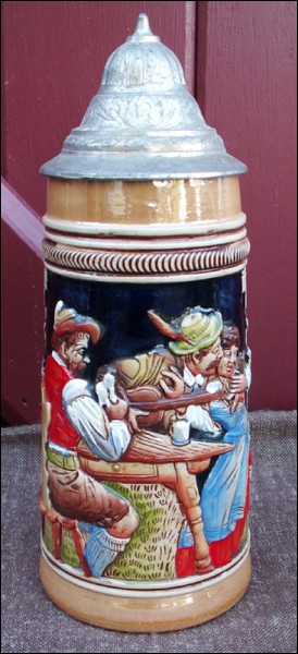 Original ceramic pewter lidded beer stein made by the King factory in Germany during the 1940's. The relief decor shows a scene of bavarian tavern. Perfect condition. 9" high. It's stamped on the back 300 1/2 Original King.