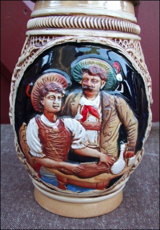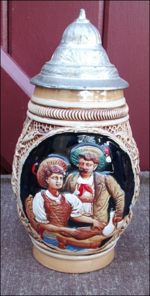 Original ceramic pewter lidded beer stein made by the King factory in Germany during the 1940's. The relief decor shows a scene of bavarian tavern. Perfect condition. 8" 1/4 high. It's stamped on the back 500 Original King.