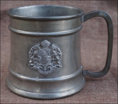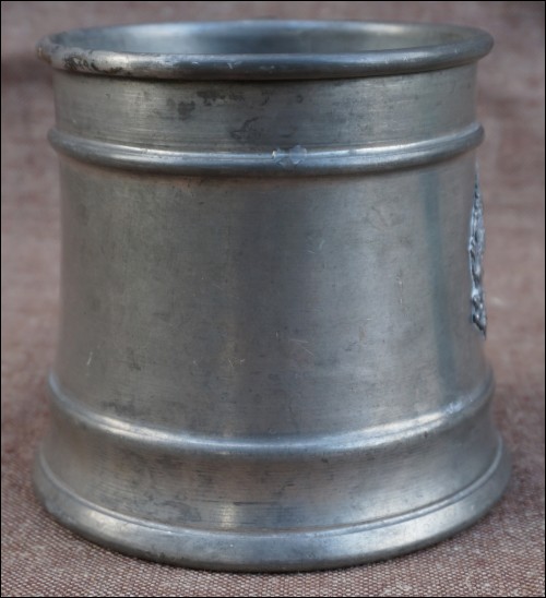 Providentiae Memor German stein beer in pewter showing the Saxe Kingdom arms in 1908. Good condition, the edge is slightly twisted , small bumps and small stains as presented on the following pictures. 4 1/8" high 4 1/2" diameter.