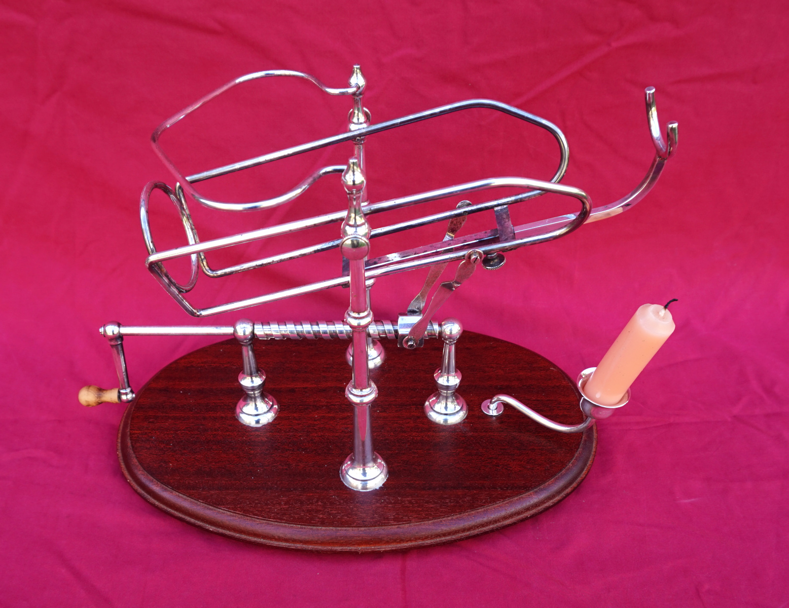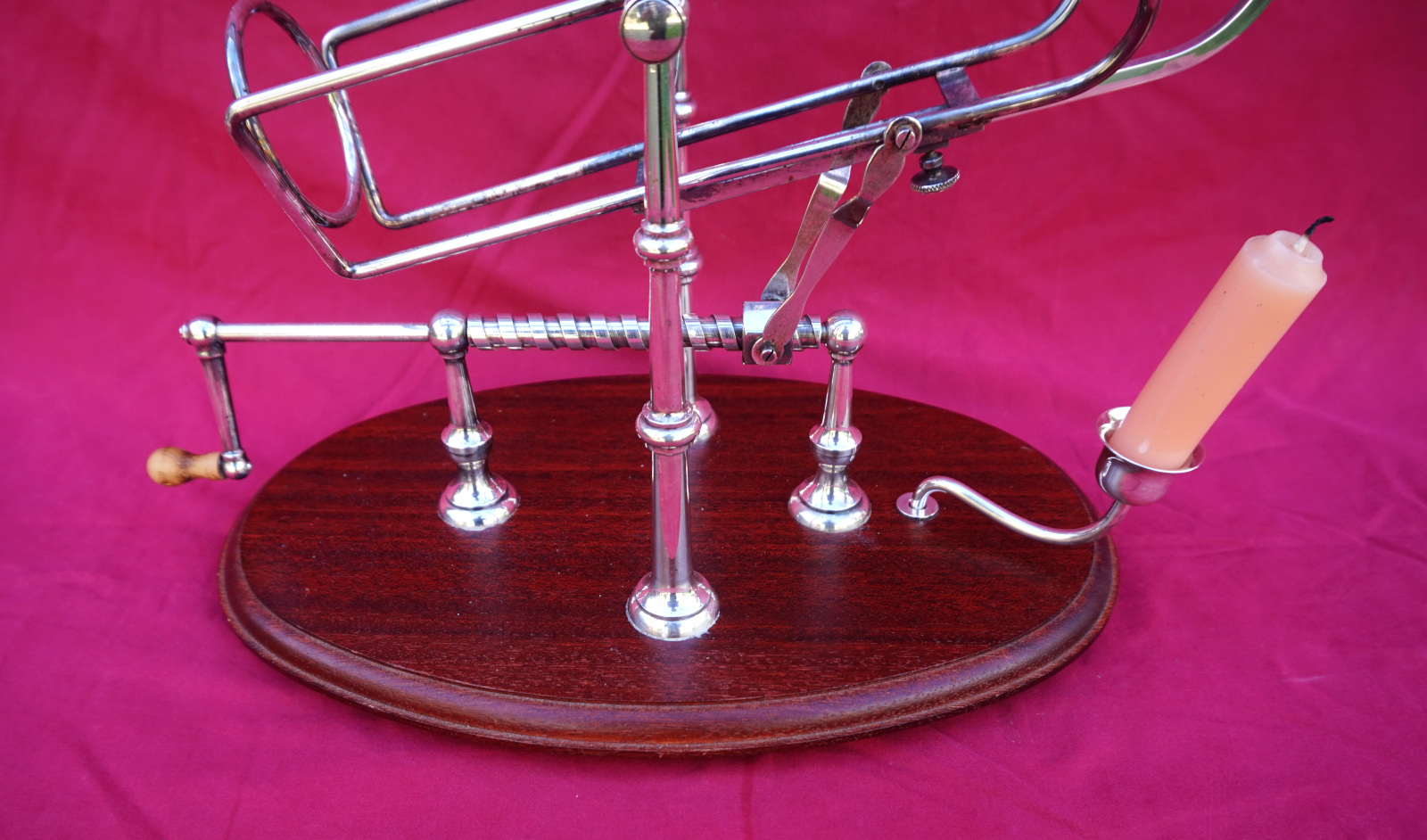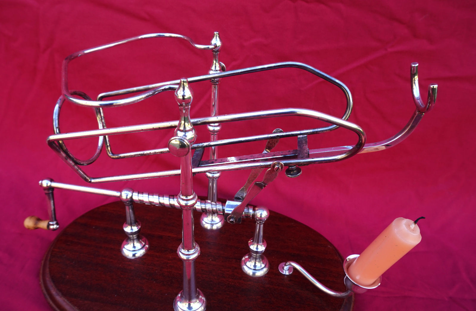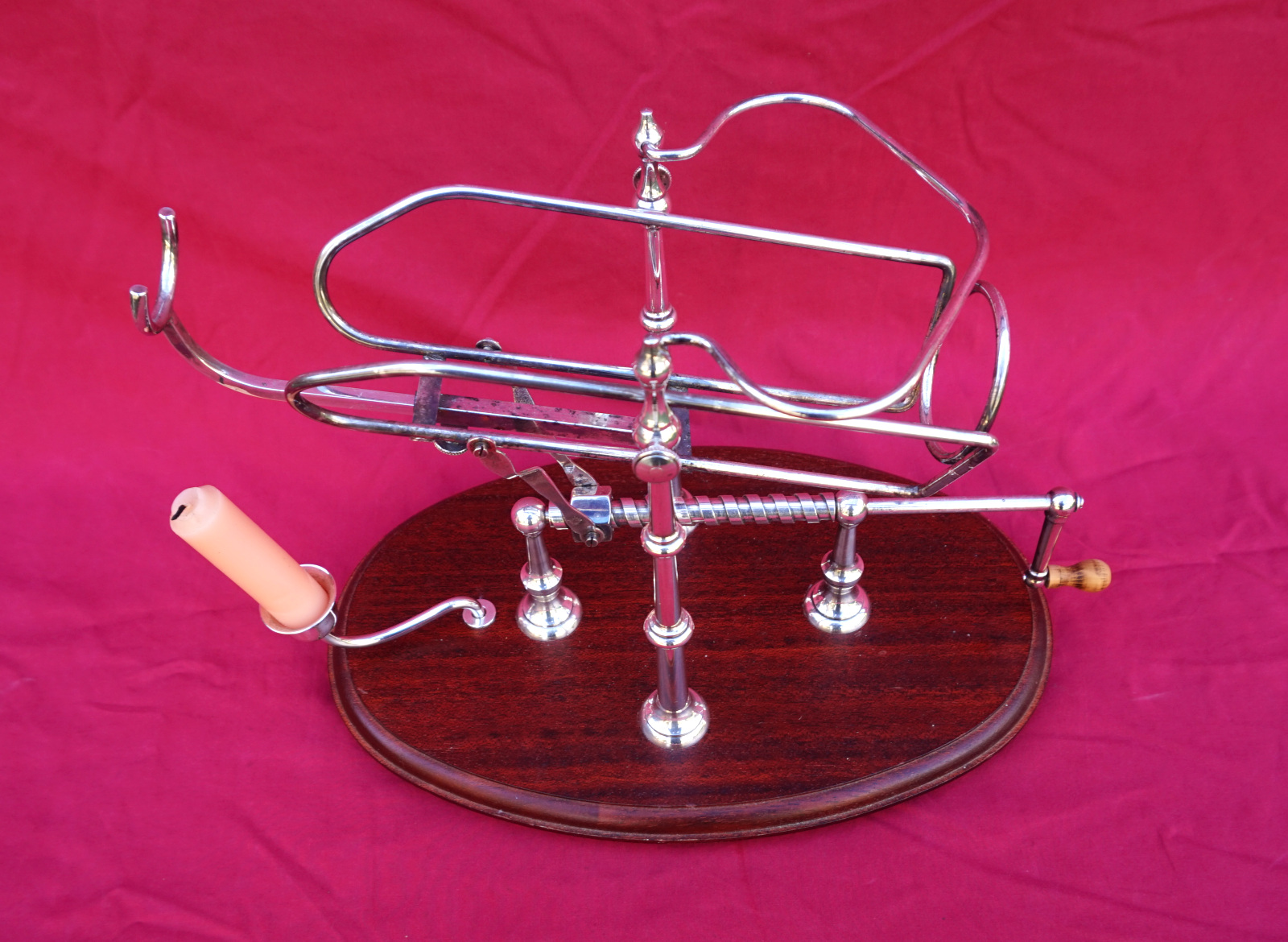 Wine Bottle Cradle Stand Mechanical Hand Crank Silverplate Mahogany 1950's