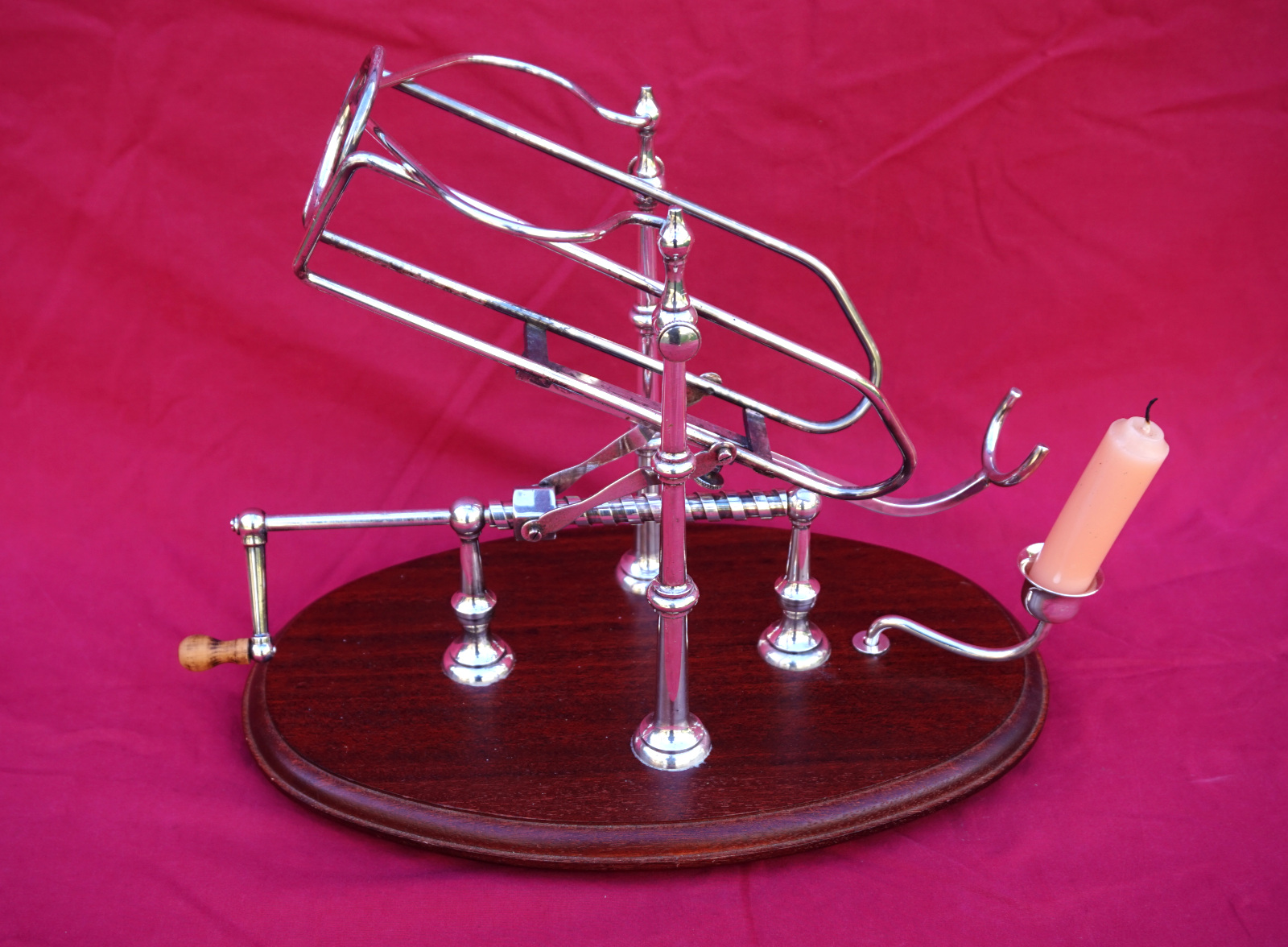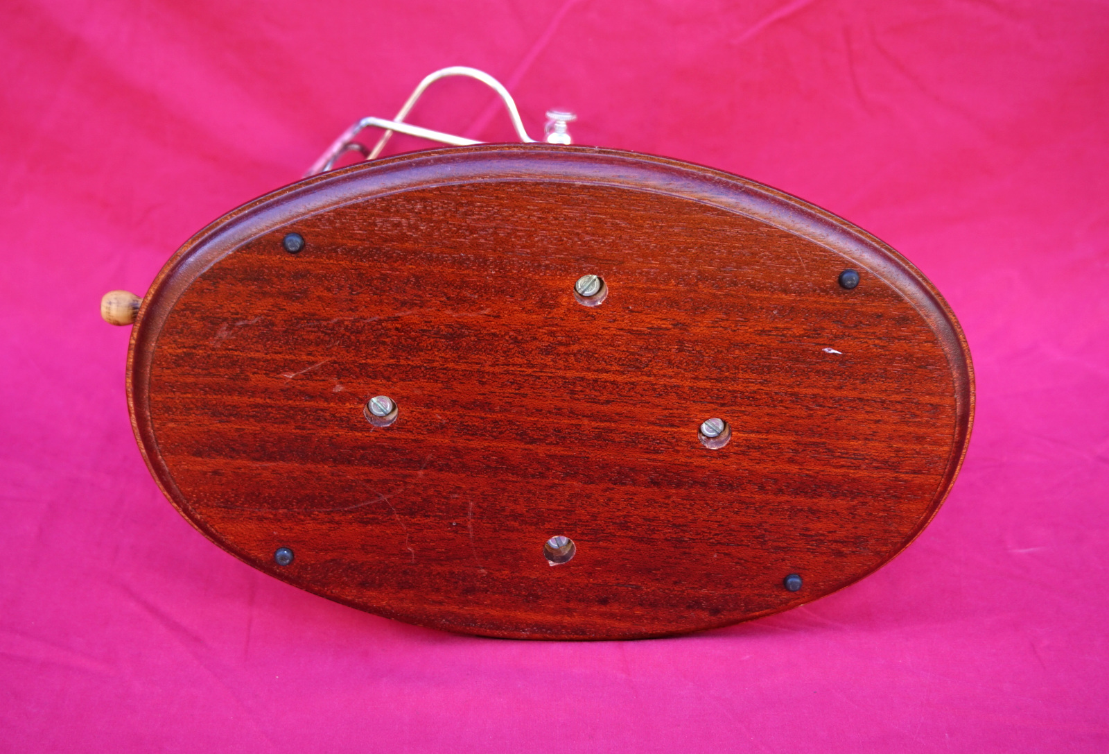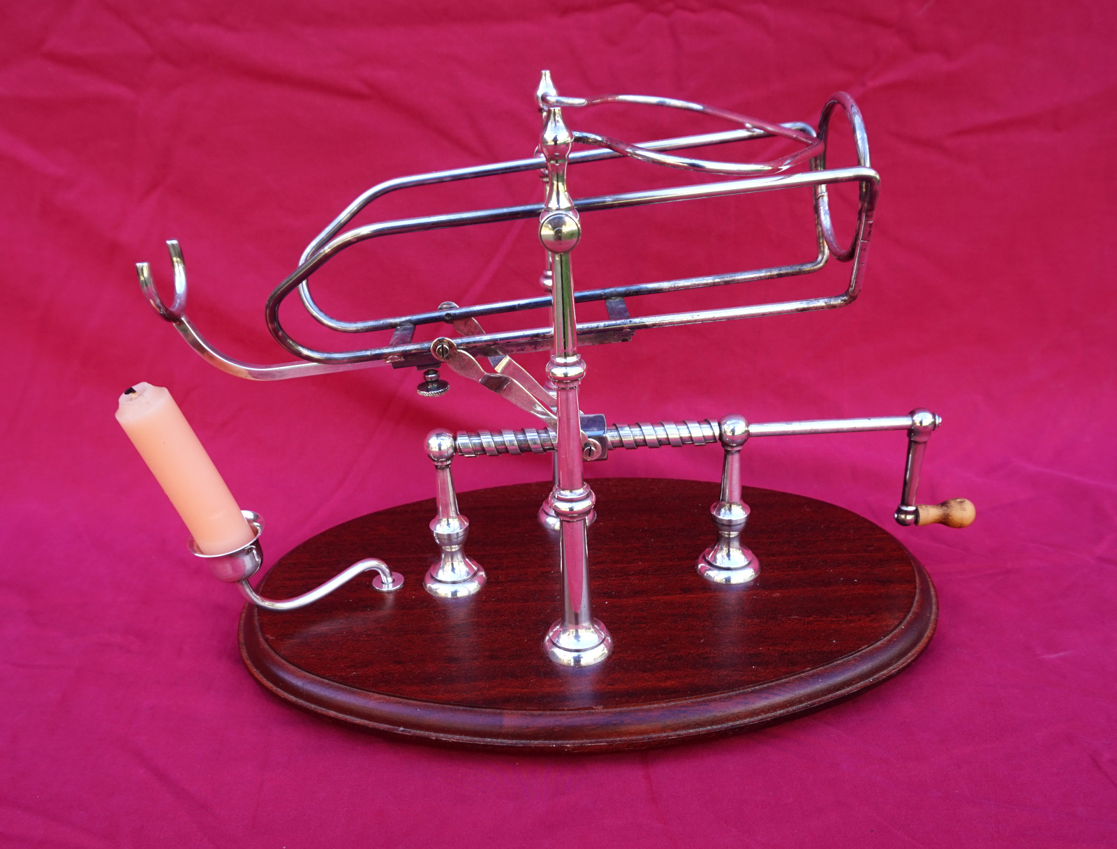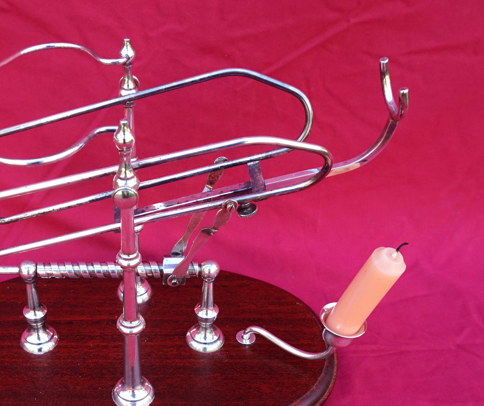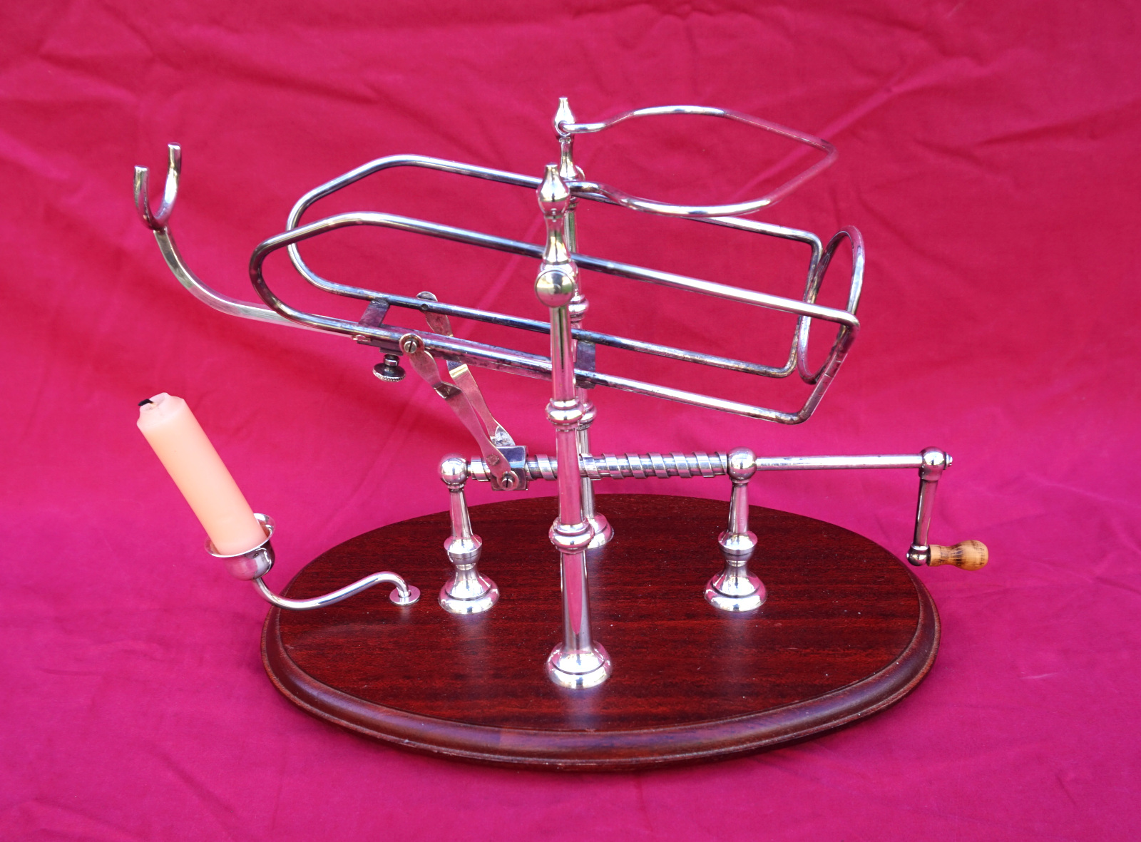 Wine Bottle Cradle Stand Mechanical Hand Crank Silverplate Mahogany 1950's