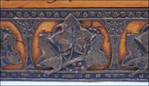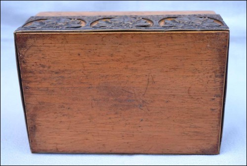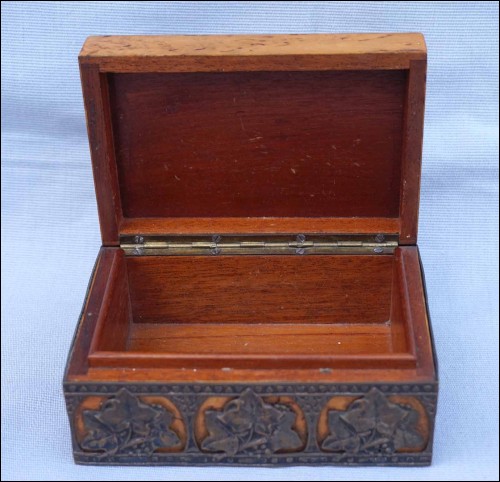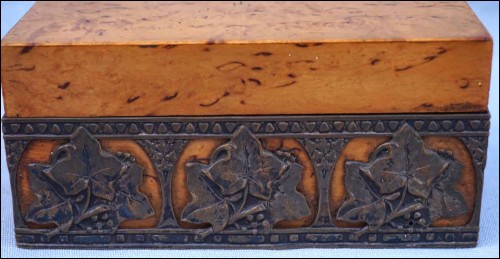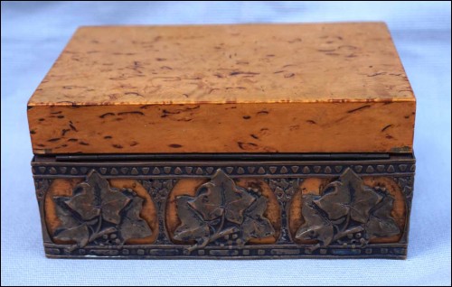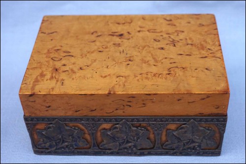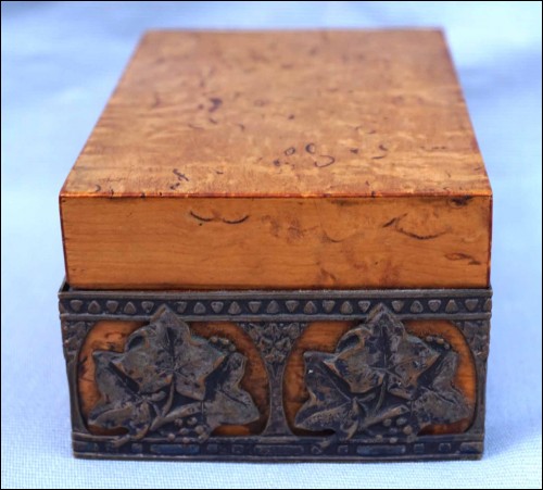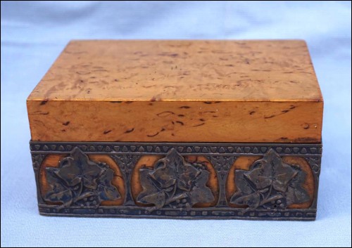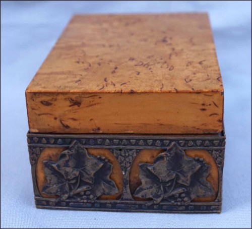 Boite en orme massif orné d'une galerie en laiton à décor de feuilles de vignes, vers 1920 période Art Deco. Largeur 13 cm, profondeur 8.5 cm, hauteur 6 cm. Très bel état.