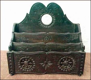 Porte lettre en bois de châtaigner de la région de Quimper, vers 1920. Il est en bon état malgré la disparition de deux graines. Hauteur 24 cm, largeur 25 cm, profondeur 11,5 cm.