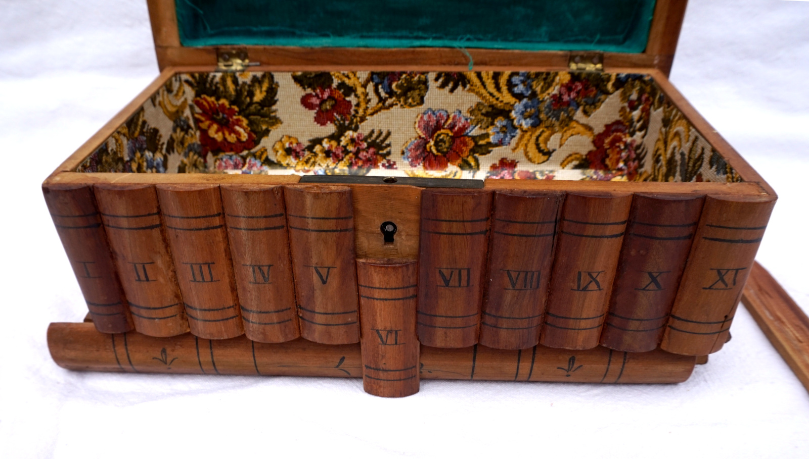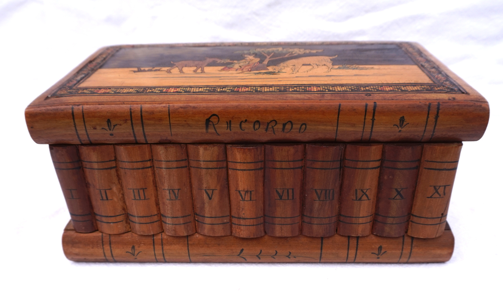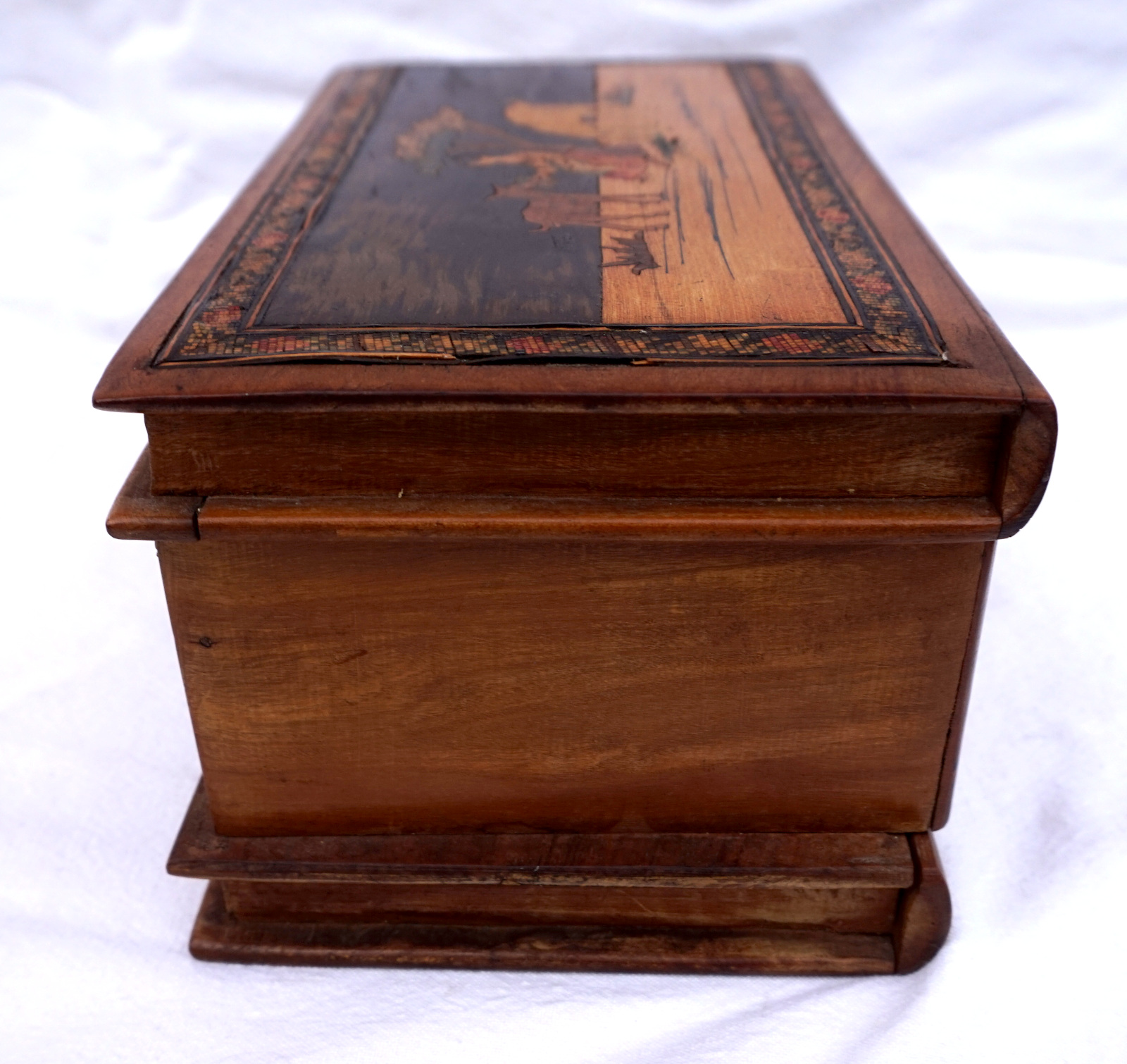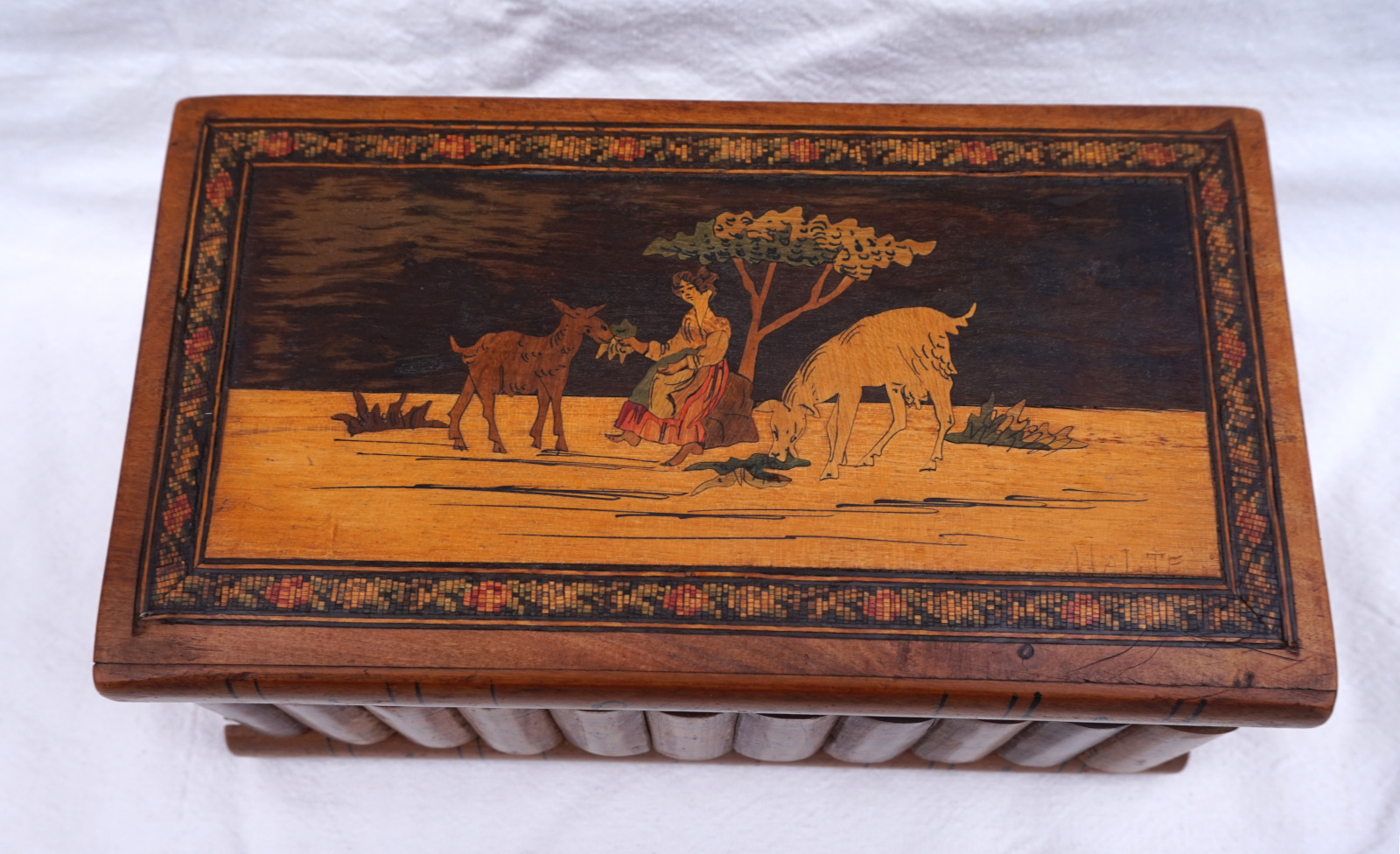 Boite à souvenir à secrets en marqueterie de noyer, montrant une scène champètre, travaille italien début XX° siècle. Il ouvre par un tiroir et une serrure secrets. Largeur 23.3cm, profondeur 13cm, hauteur 10.2cm. Parfait état avec sa clef d'origine.