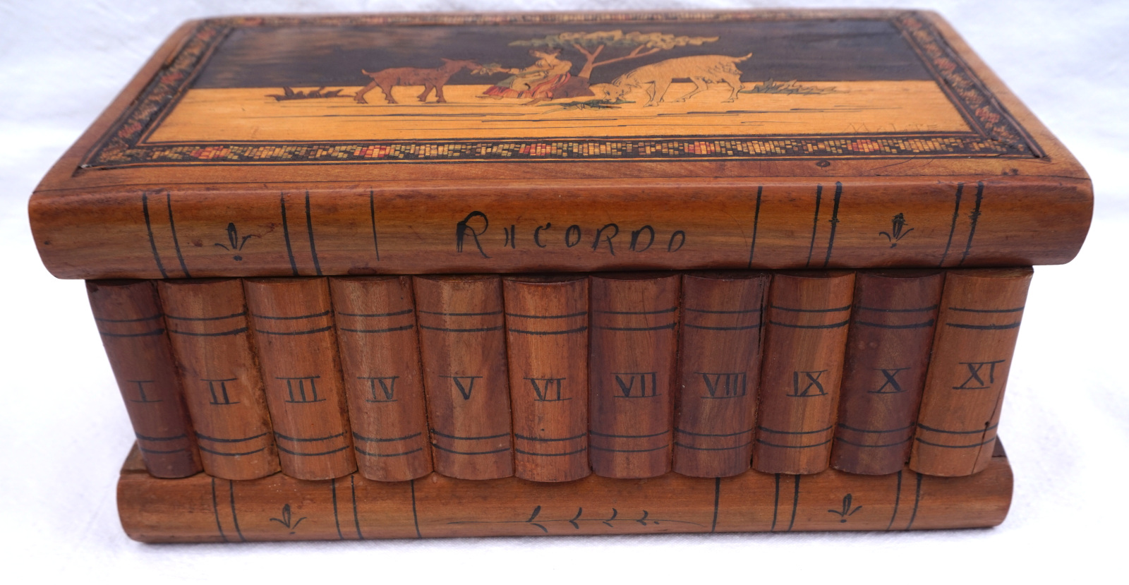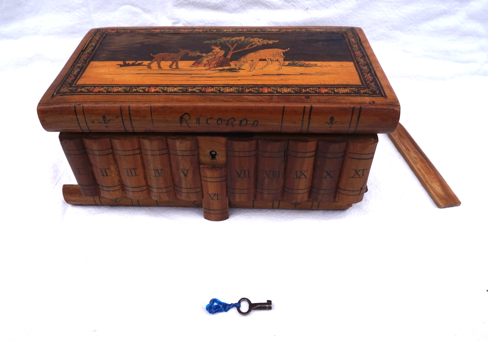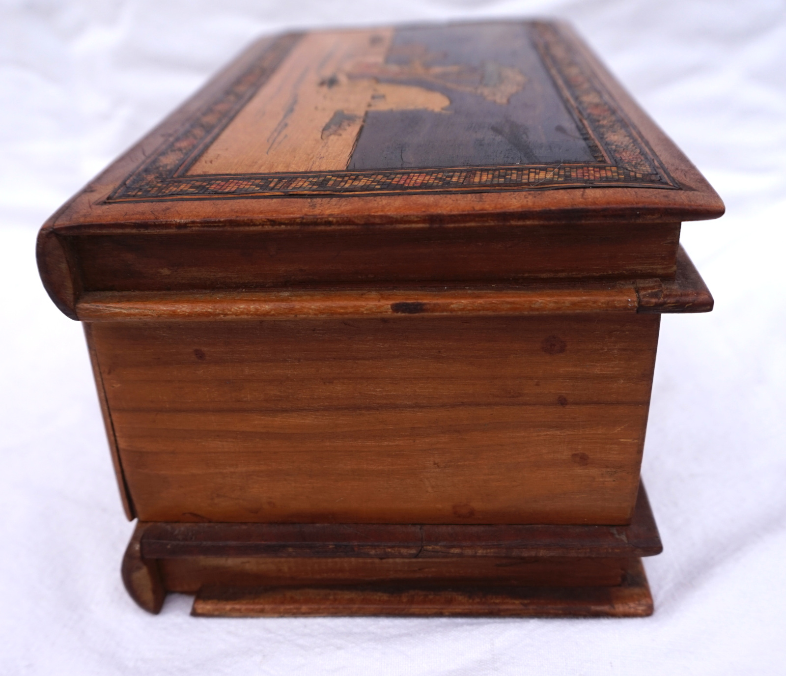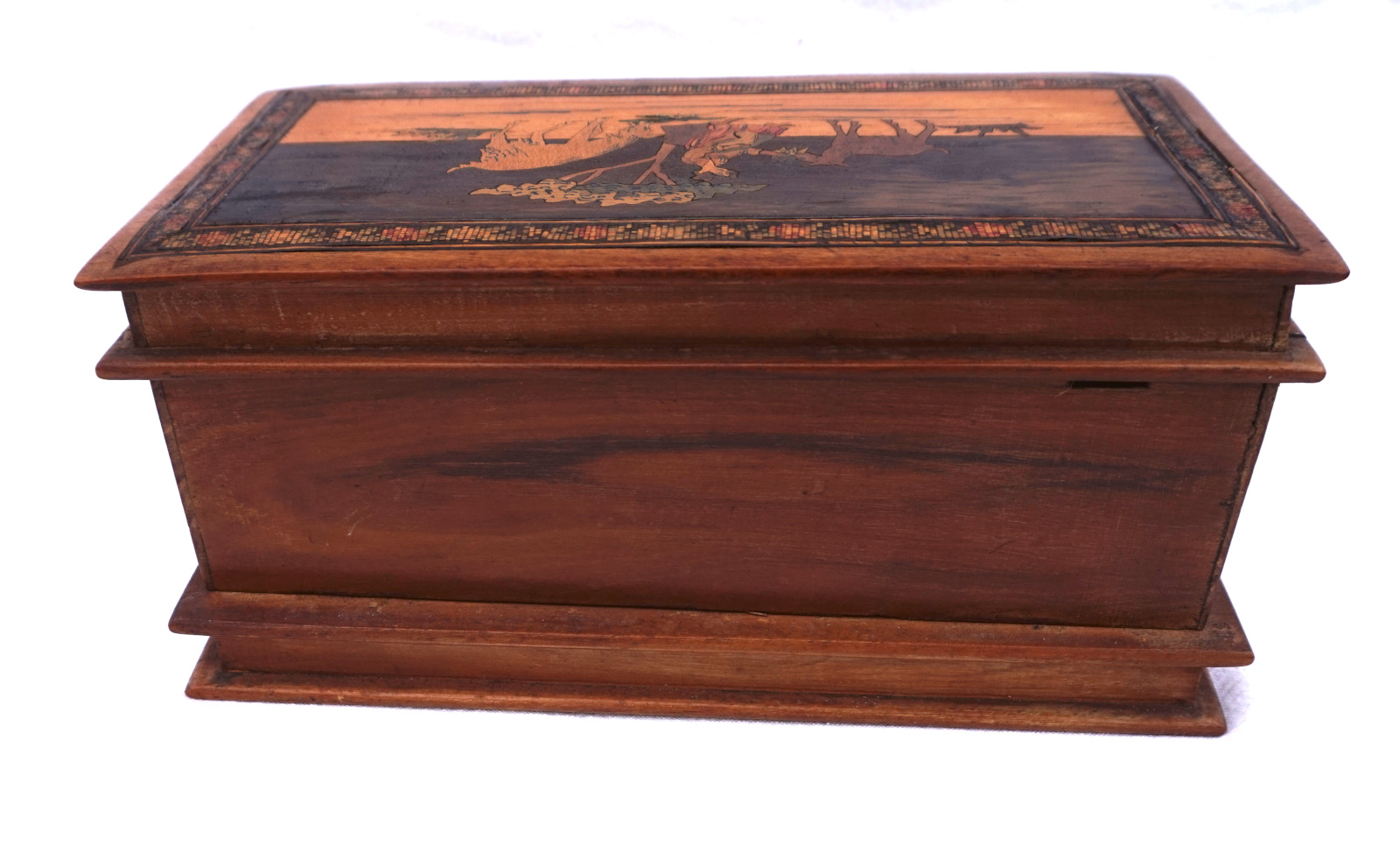 Italian souvenir "Riccordo'"letter box with secret lock and hidden drawer made early 20th century. Beautiful inlayed country scene on the top. 9 1/8" (23.3cm) width, 5 1/8" (13cm) depth, 4" (10.2cm) height. Perfect condition with its original key.