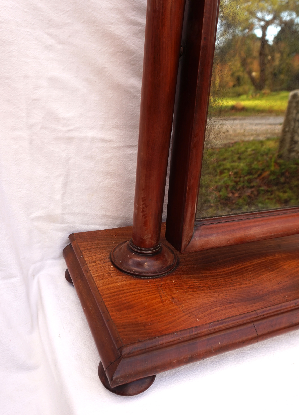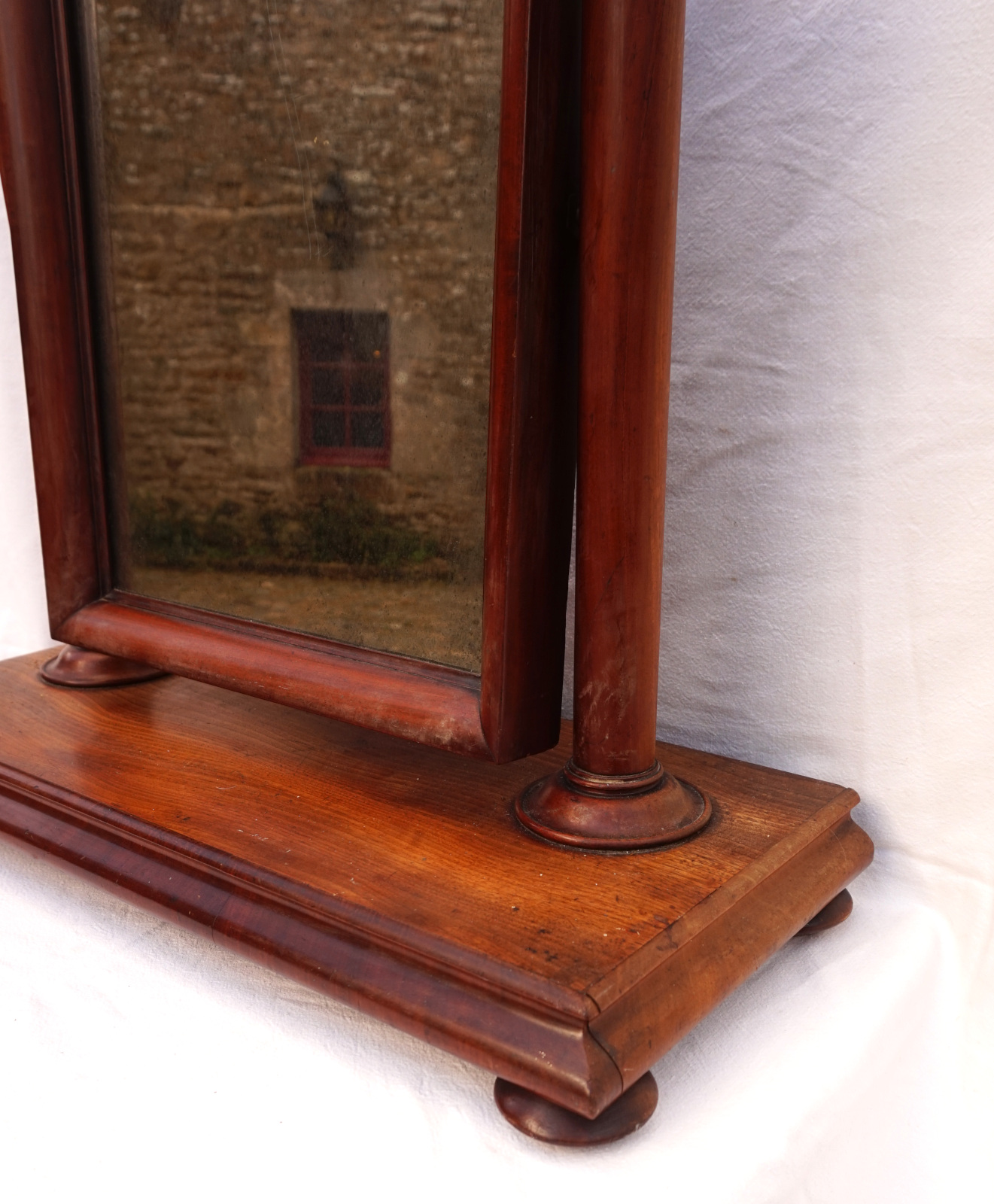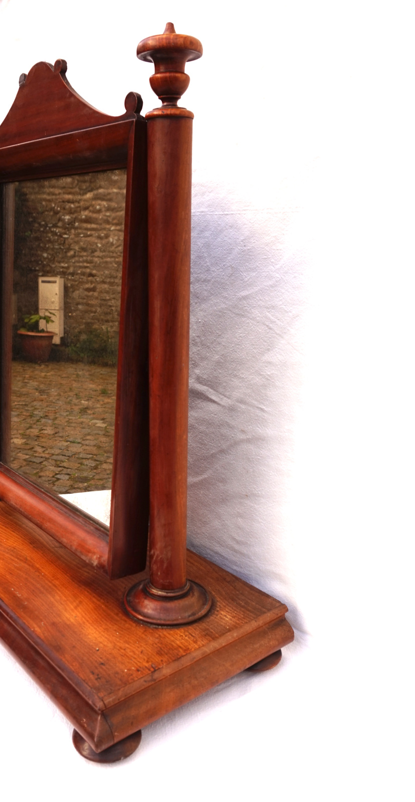 Barbière d'homme Psyché de table en acajou, miroir basculant, deuxième moitié du XIXe siècle. Hauteur 71 cm, largeur 69 cm, profondeur 29.5 cm. Très bel état, une volute refaite, quelques taches sur le miroir.