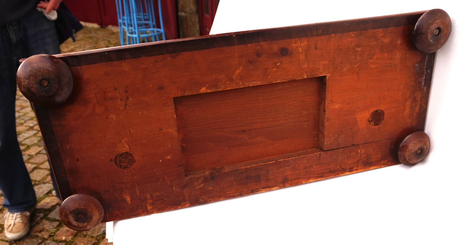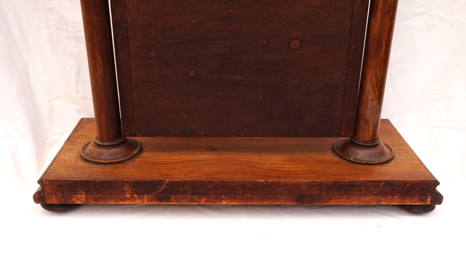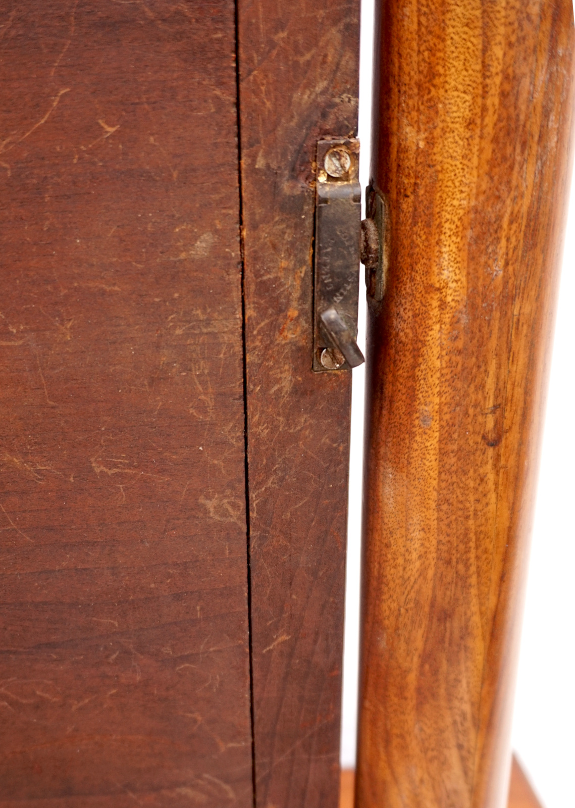 Barbière d'homme Psyché de table en acajou, miroir basculant, deuxième moitié du XIXe siècle. Hauteur 71 cm, largeur 69 cm, profondeur 29.5 cm. Très bel état, une volute refaite, quelques taches sur le miroir.
