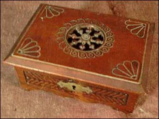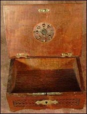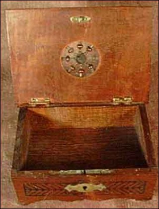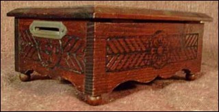 Wood bank in chestnut all hand carving and turning made near Quimper about 1960. Good condition a few small worn and the key is missing. 2"1/2 tall 6" width 4"1/2 depth.