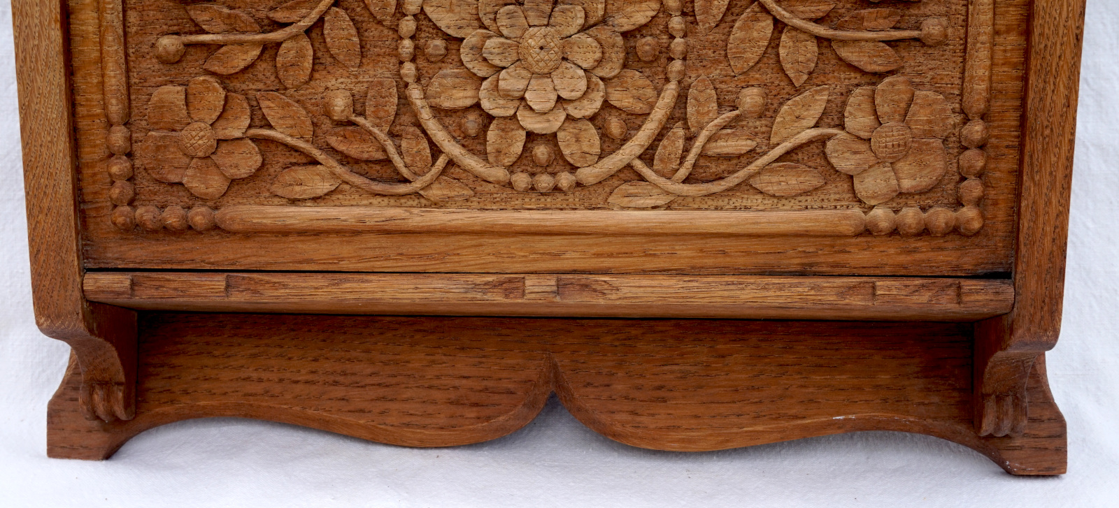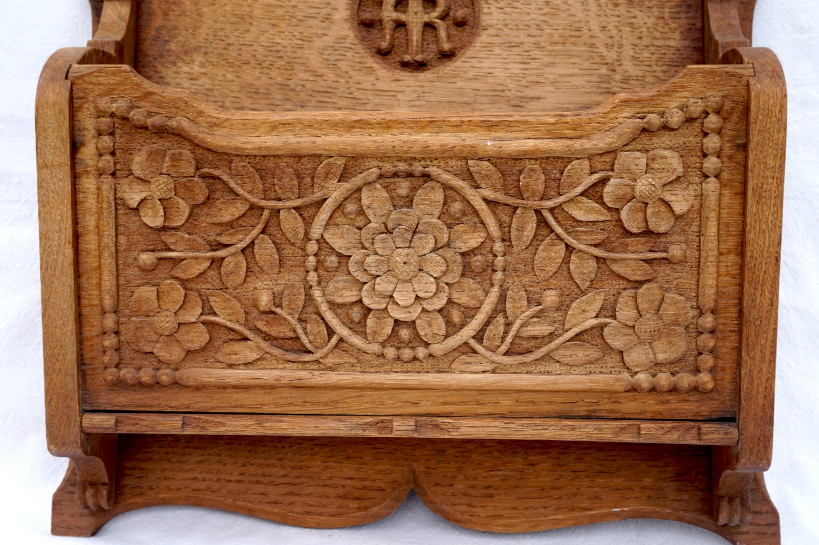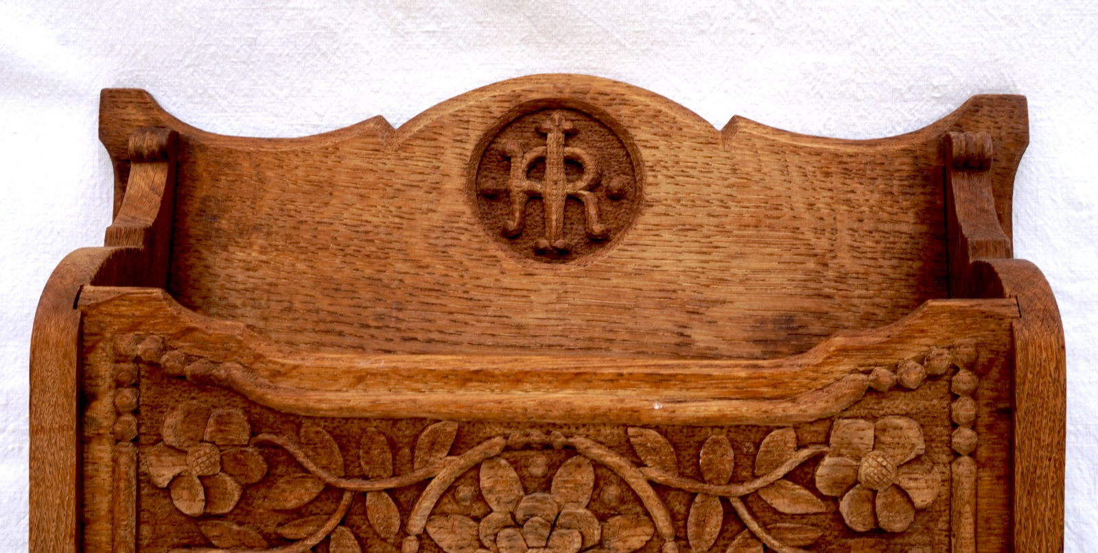 French wall letter holder in carved wood with IR monogram made by Louis Robert Isaac near Quimper during the 1920's. 11 3/4" (30cm) height, 13 7/8" (35.2cm) width, 3 3/4" (9.5cm) depth. It's signed on the back. Perfect condition.