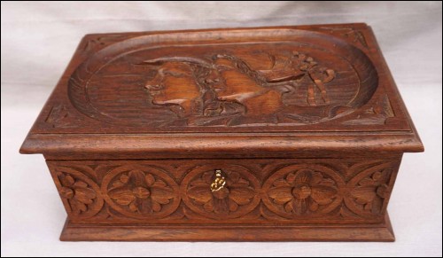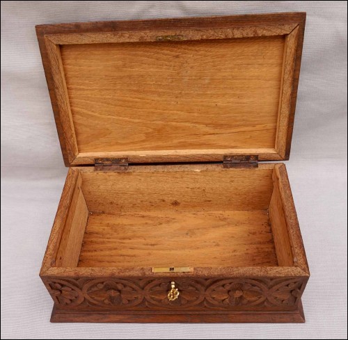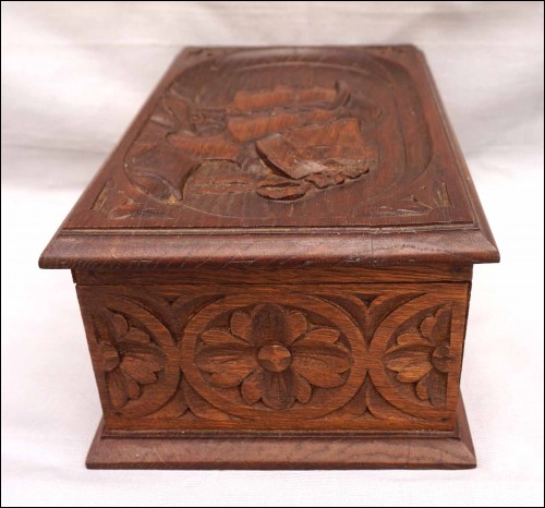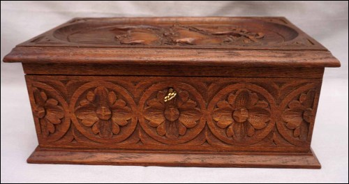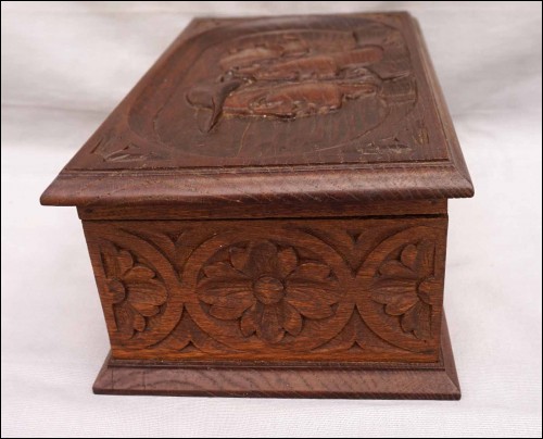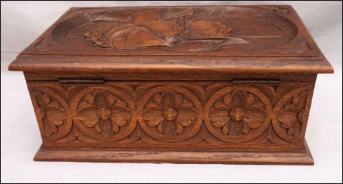 Coffret de mariage, boite à courrier en bois de châtaigner sculpté de la région de Quimper, milieu du XXe siècle. Bel état d'usage, la serrure d'origine a été changée. Longueur 31 cm largeur 18.9 cm, hauteur 12.5 cm.