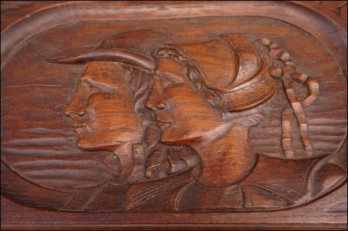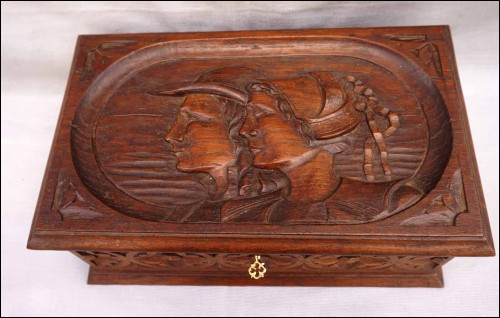 Vintage carved wood wedding letter box sowing a couple of breton made near Quimper during the mid-century. 12 1/4" (31cm) length, 7 1/2" (18.9cm) width, 5" (12.5cm) height. Perfect condition, the lock isn't original, as shown by the following pictures.