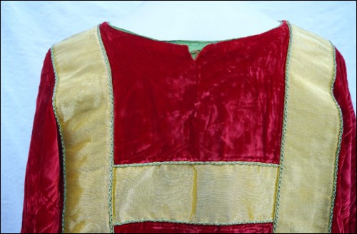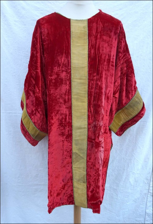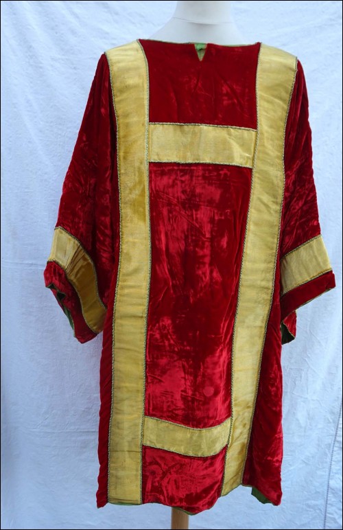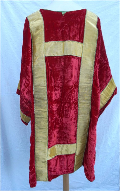 Pair Roman chasubles in red velvet with green lining ornate with golden thread braids. 55" width, 44" height and for the second 52" width and 41 1/2" height. Good condition just a few tears to the eck as shown by the following pictures.