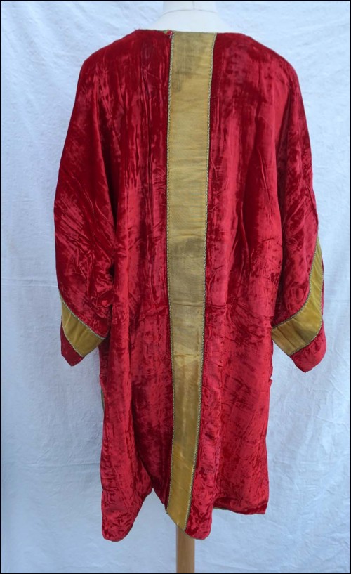 Chasuble romaine en velours de soie orné de galons d'or. La doublure est en soie verte. Bon état quelques petites déchirures (voir photo du cou). Largeur 140 cm, hauteur 112 cm. Chasuble romaine en velours de soie orné de galons d'or. La doublure est en soie verte. Quelques usures du temps bel état. Largeur 134 cm, hauteur 105 cm.