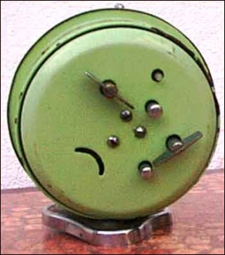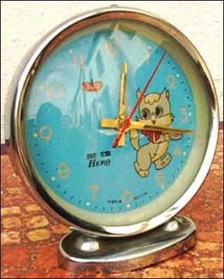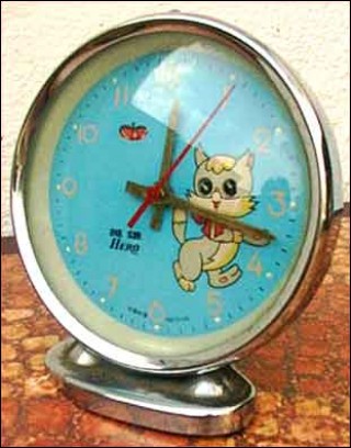 Alarm clock with Kitty the Cat toon made in China during 70's. The eyes cat turn at the same time that the second hand. Good condition it works very well only the pedestal is lightly twisted as you can see on the pictures below. 4"3/4 tall 4"1/4 diameter