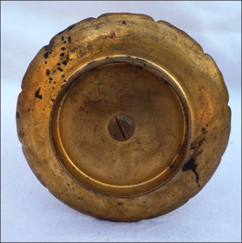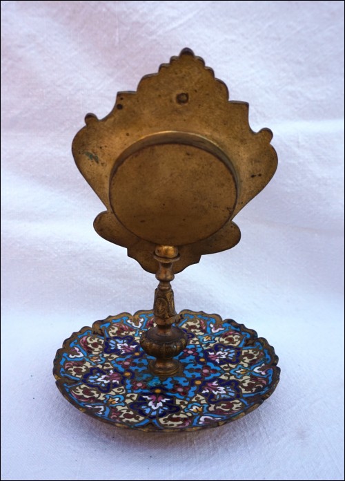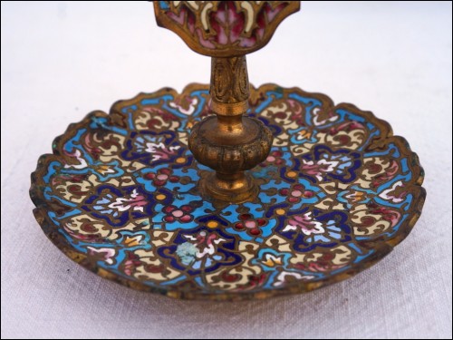 Porte montre en émail champlevé sur bronze, vers 1880. Hauteur 12.7 cm, diamètre 18.2 cm, poids 225 gr. Très bel état.