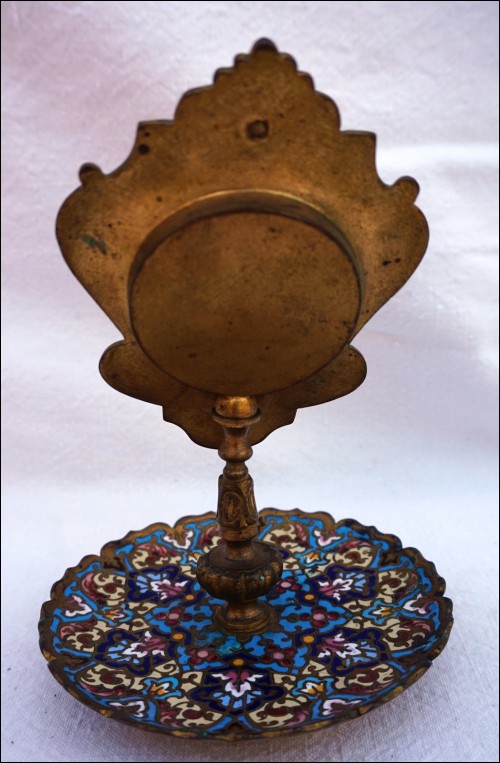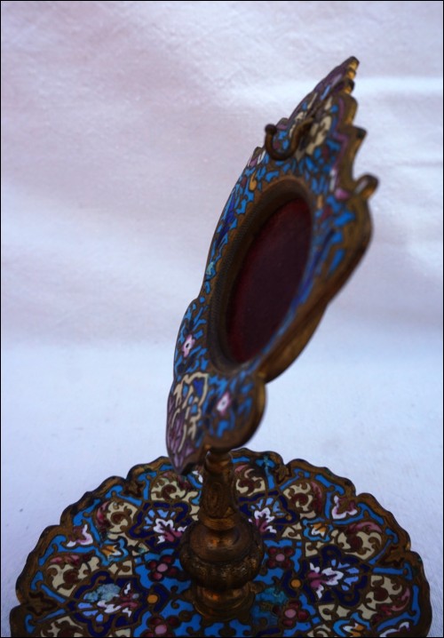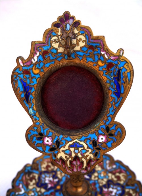 Antique french champleve cloisonne enamel pocket watch holder made during the 1880's. 5" (12.7cm) height, 4"(10,2cm) diameter to the base, weight 7.93oz (225 grams). Beautiful condition, the red velvet inside the medallion is used as shown by the following pictures.