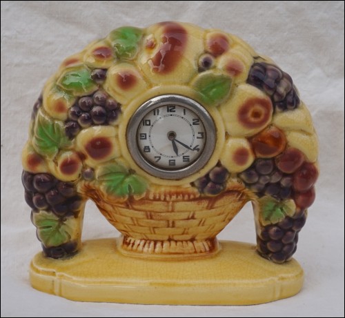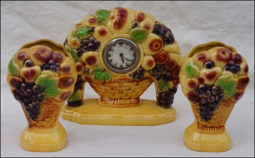 Art Deco Majolica Mantle Clock Set Garniture Vase ESDEVE Sarreguemines