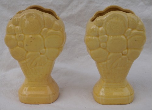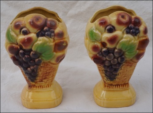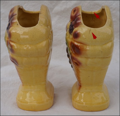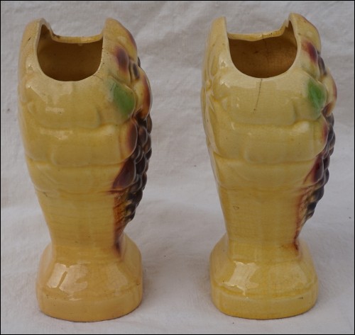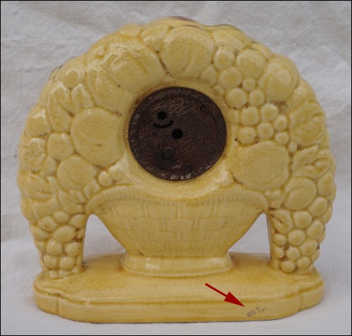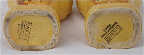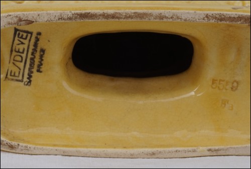 Garniture de cheminée en barbotine de Sarreguemines, vers 1930, signée ESDEVE lire S.D.V pour Sarreguemines-Digoin-Vitry le François, ces dernières étaient des filiales de Sarreguemines. Elle est en bel état d'usage, une larme au dos de la pendule, deux cheveux sur un vase, le mouvement ne fonctionne pas. Pour la pendule: hauteur 20 cm, largeur 21 cm, épaisseur 8 cm.