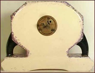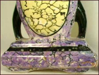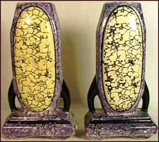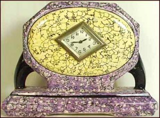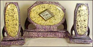 Garniture de cheminée, composée d'une pendule et de deux vases, sûrement née vers 1940 dans la manufacture de Wasmuël en Belgique. En majolique à décor Marbré, ces trois pièces ne sont pas signées, un numéro de modèle et deux marques en creux pour la pendule. La pendule et un accompagnement sont en bon état, la troisième pièce est bien accidentée. Hauteur 23 cm, largeur de la pendule 31 cm.