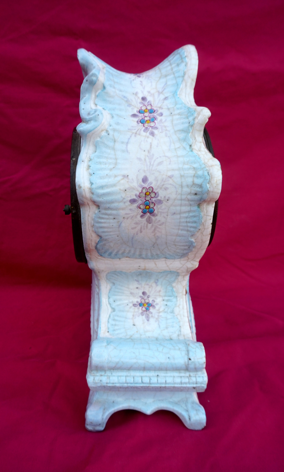 French Louis XV style ceramic mantle clock with 8 days movements made during the 1900's. 12 1/4" (31cm) height, 8 5/8" (22cm) width, 4 1/8" (10.5cm) depth. Good condition for the case, the key and the pendulum for the clock are missing.