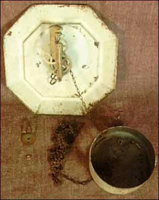 This advertising clock in enameled and painting tole has been made for the Chanteclerc oils for cars by the Unis clockmaker in France around 1950. The movement works but the pendulum and the weight are missing. The box is in painting tole. 6" tall.