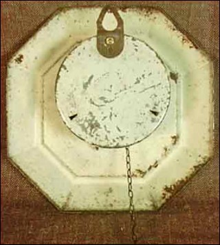 Pendule murale publicitaire pour l' huile pour autos Chanteclerc. Le mouvement de marque Unis est en état de fonctionnement, il a perdu son balancier et son poids. Le boîtier est en tôle peinte. Hauteur 15 cm.