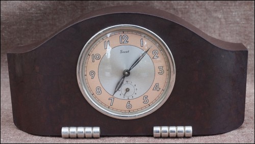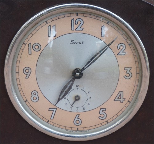 French Art Deco bakelite alarm clock with Scout movement made during the 1930's. Not in good condition, the case is damaged on the corners, as presented on the following pictures, the movement works but the spring is off the hook. 10 3/8" width, 5 3/8" height, 2 3/8" depth.