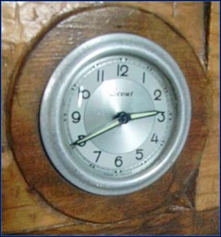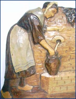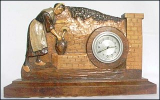 Pendule de cheminée du pays basque, en bois sculpté de hêtre, peinte et vernis: technique mixte. Le mouvement est de la maison Scout, il fonctionne mais à besoin d'un bon nettoyage et n'a plus sa clef. Né vers 1935, la scène représente une femme en costume traditionnel à la fontaine. Largeur 28.5cm, hauteur 19cm.