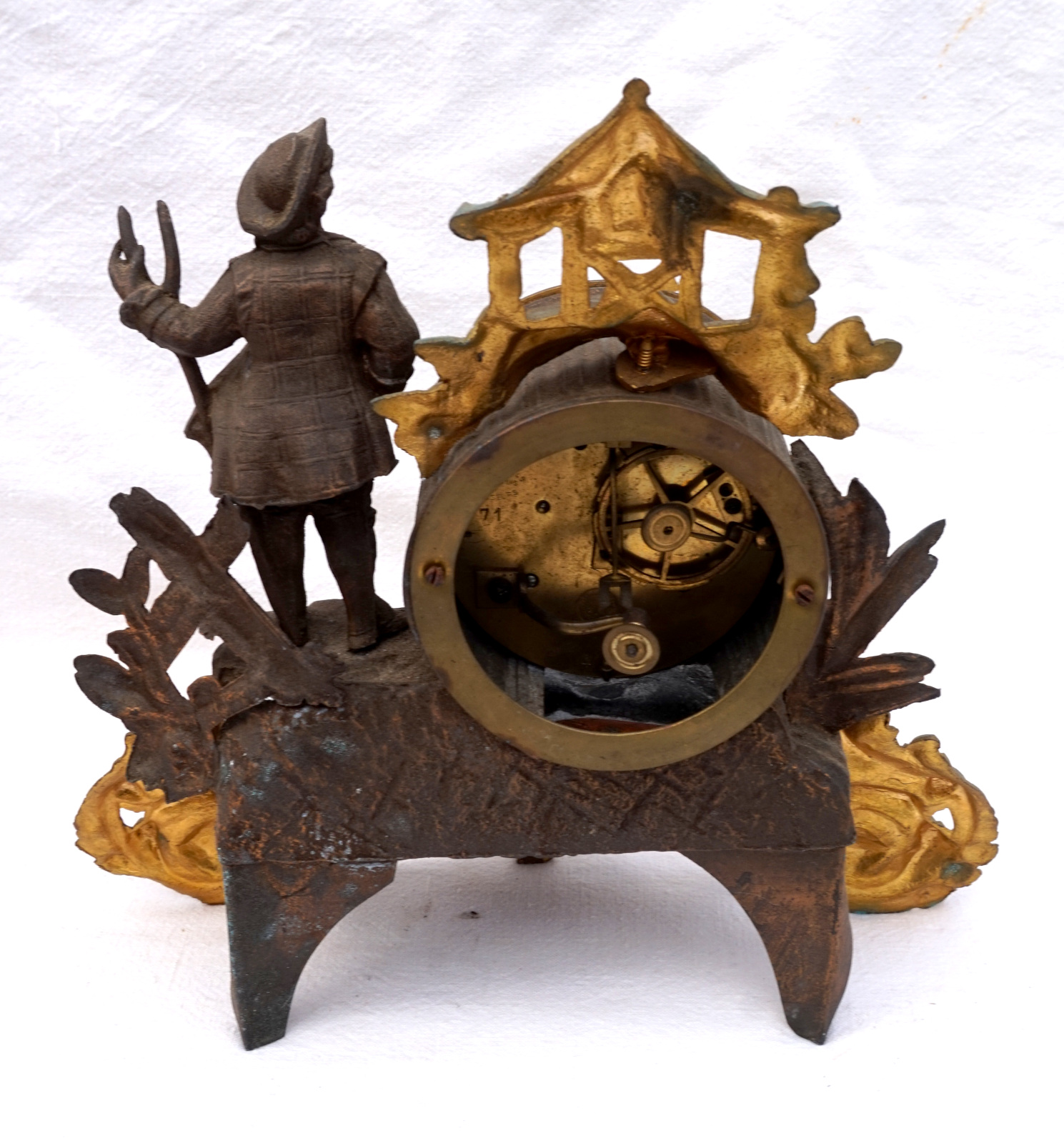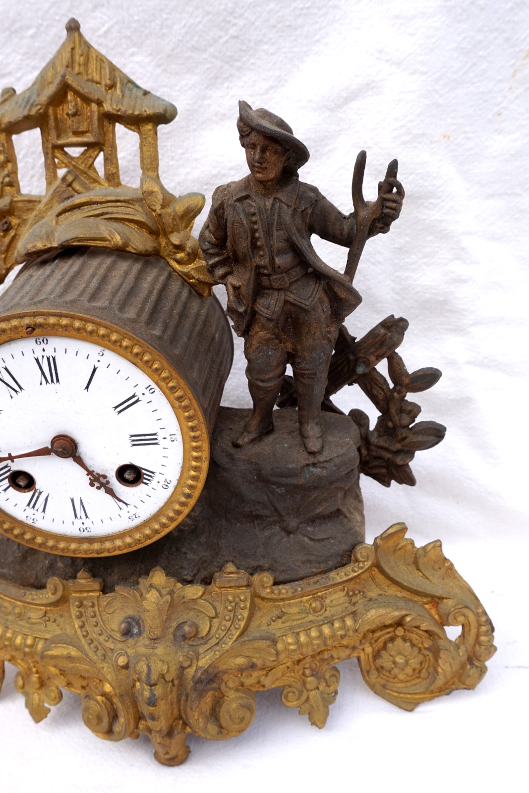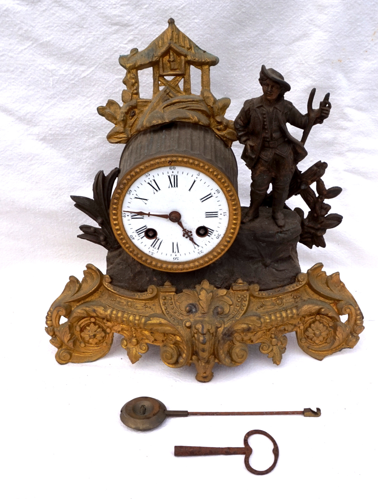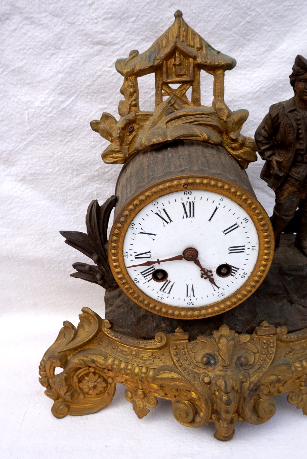 French gilt and patina spelter clock showing farmer with 8 days Paris movement by Raison and Thomas made late 19th century. 10 1/4" (26cm) height, 10" (25.5cm) width, 4" (10cm) depth, weight 3 lb 7oz (1.565 kilogram). Good condition, the movement needs repair.