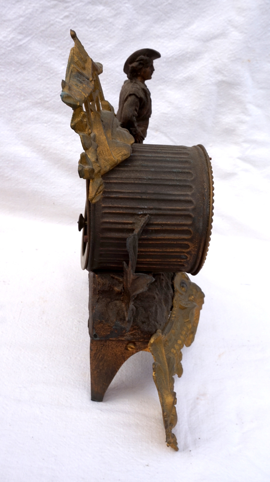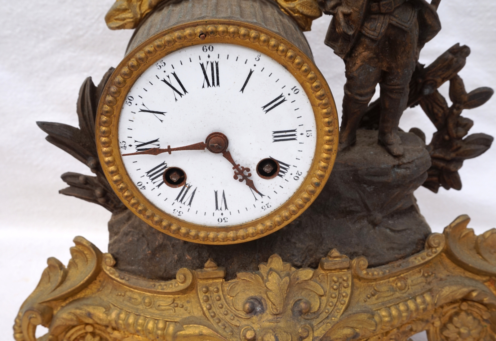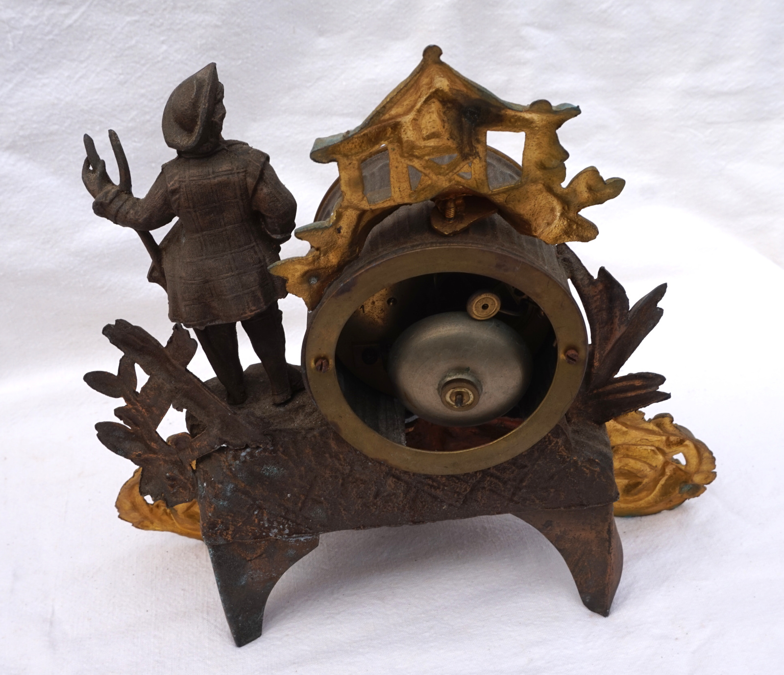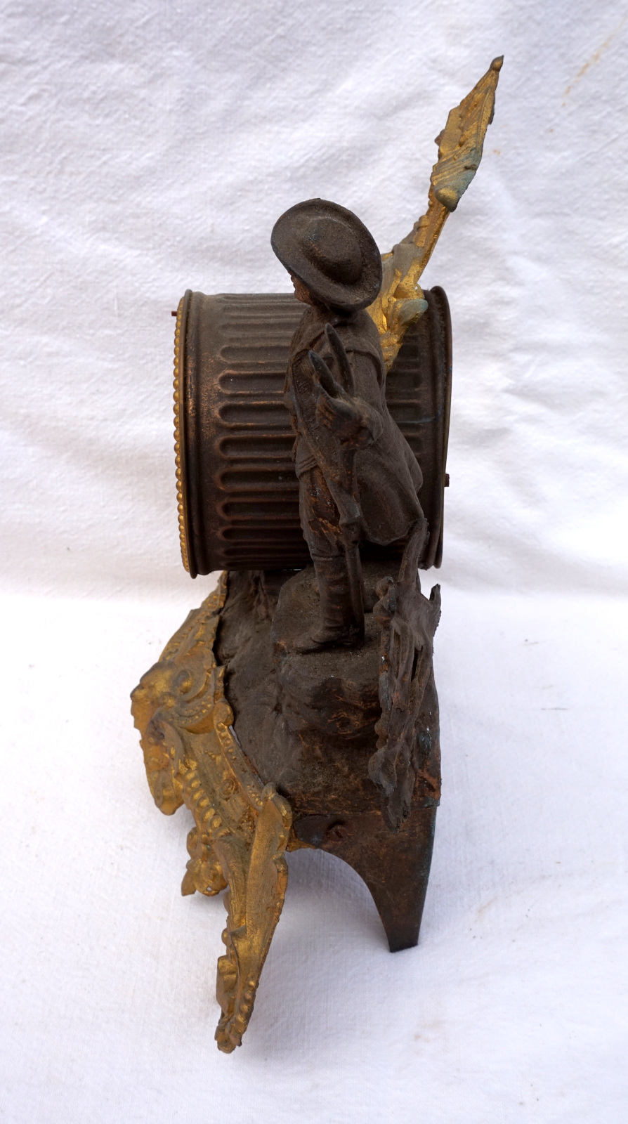 French gilt and patina spelter clock showing farmer with 8 days Paris movement by Raison and Thomas made late 19th century. 10 1/4" (26cm) height, 10" (25.5cm) width, 4" (10cm) depth, weight 3 lb 7oz (1.565 kilogram). Good condition, the movement needs repair.