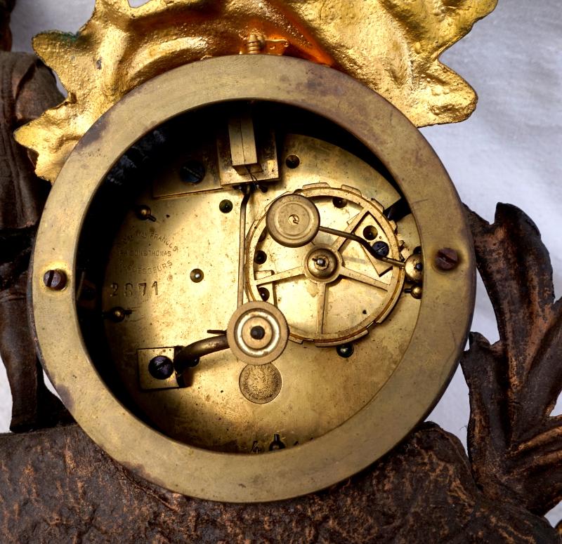 Pendule en régule doré et patiné orné d'un paysan, mouvement de Paris de Raison et Thomas, vers 1880's. Hauteur 26 cm, largeur 25.5 cm, profondeur 10cm, poids 1.565 kg. Bel état, le mouvement a besoin d'être révisé.