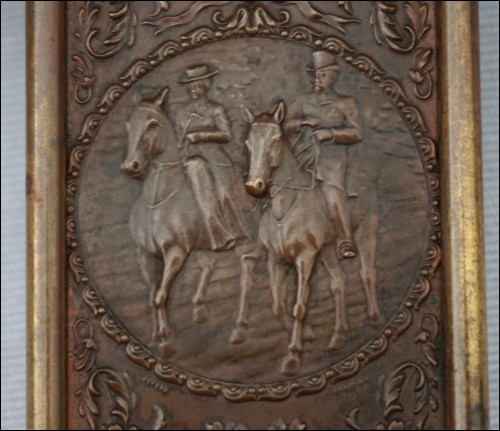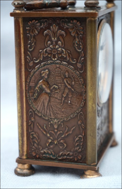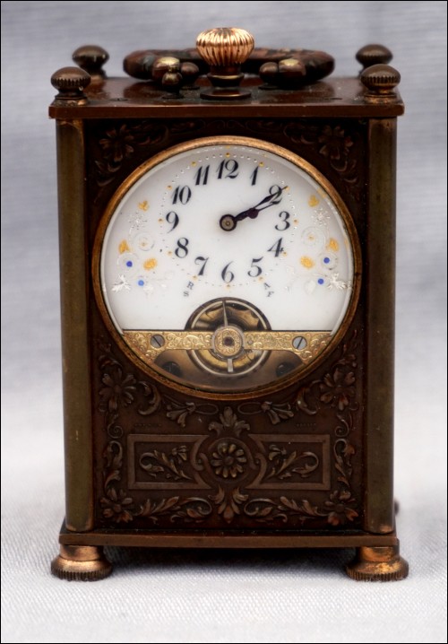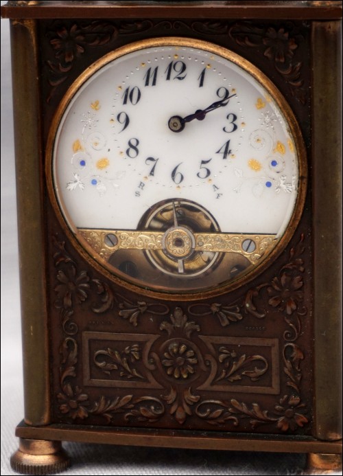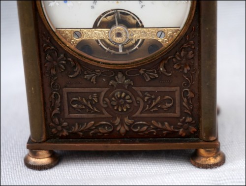 Swiss carriage clock with bronze case and hand painted enamel dial made by Frainier and Swiss 8 days movement by Hebdomas in Geneva. The bronze are signed and the clock stamped on the top. 3 1/2" (8.9cm) height, 2 1/4" (5.7cm) width, 1 3/4" (4.3cm) depth, weight 11.11oz (315grams). Beautiful condition, the movemen watchmaker serviced works perfectly and keeps the time, as shown by the following pictures.
