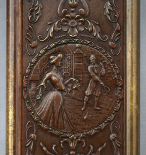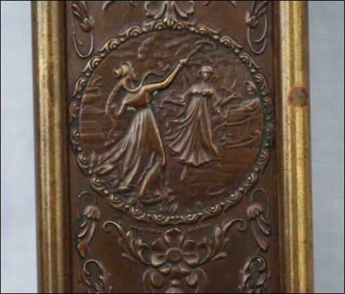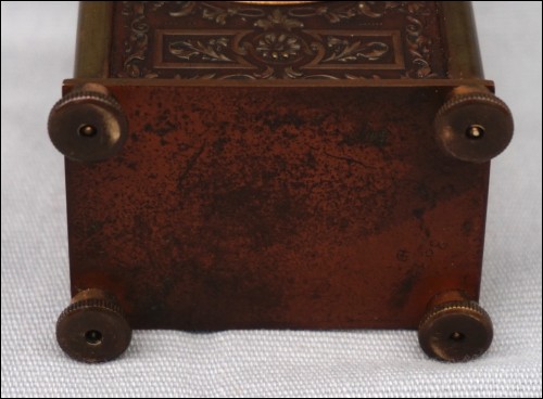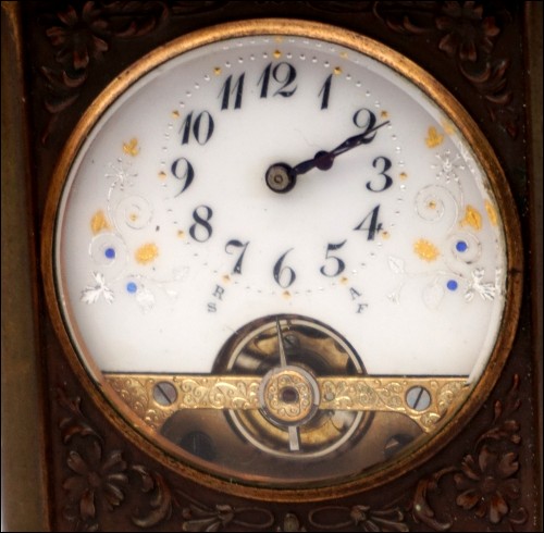 Pendule de voyage en bronze patine médaille par Frainier pour le boitier, avec un mouvement de 8 jours de la manufacture Hebdomas Genève Suisse vers 1910. Elle est ornée d'un cadran en émail rehaussé avec le ressort spirale visible. Elle est signée sur le dessus et les panneaux latéraux sont signés dans le décor. Hauteur 9 cm, largeur 5.7cm, profondeur 4.3 cm, poids 315gr. Le mouvement à été révisé et fonctionne parfaitement.