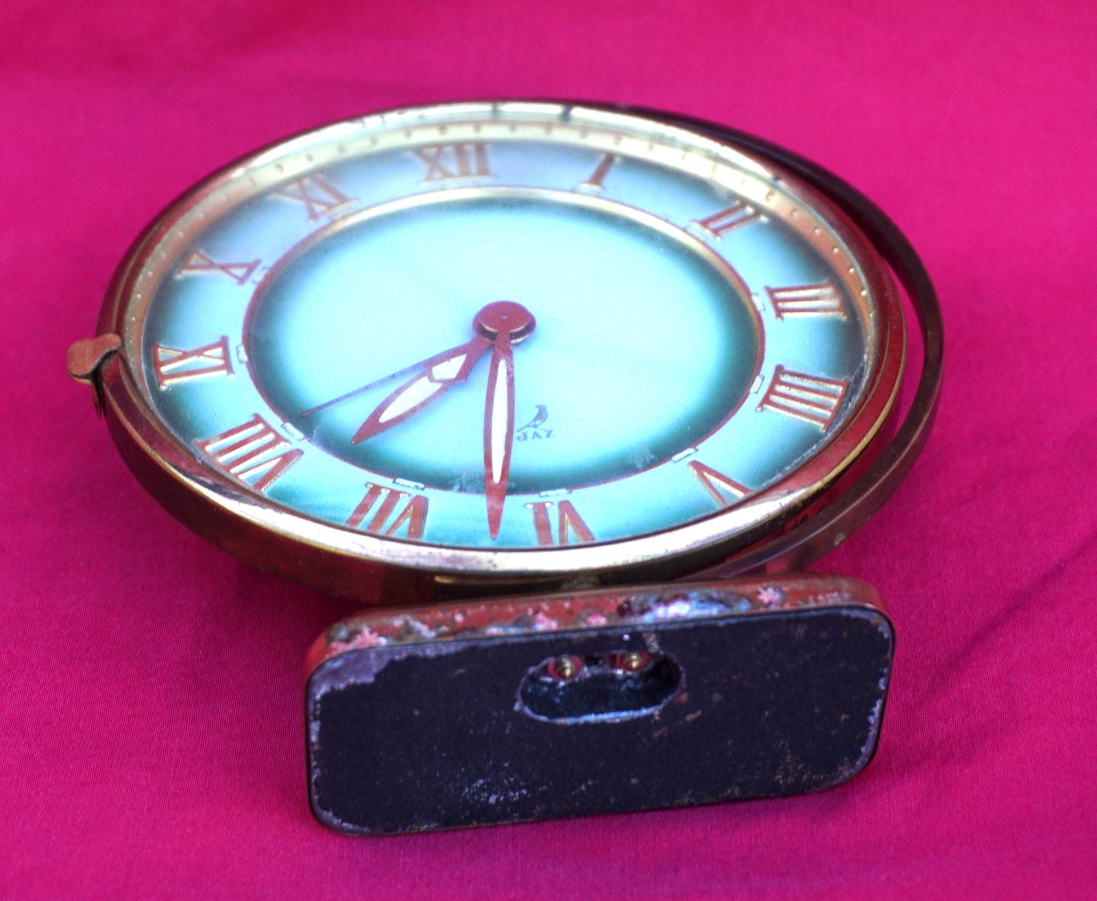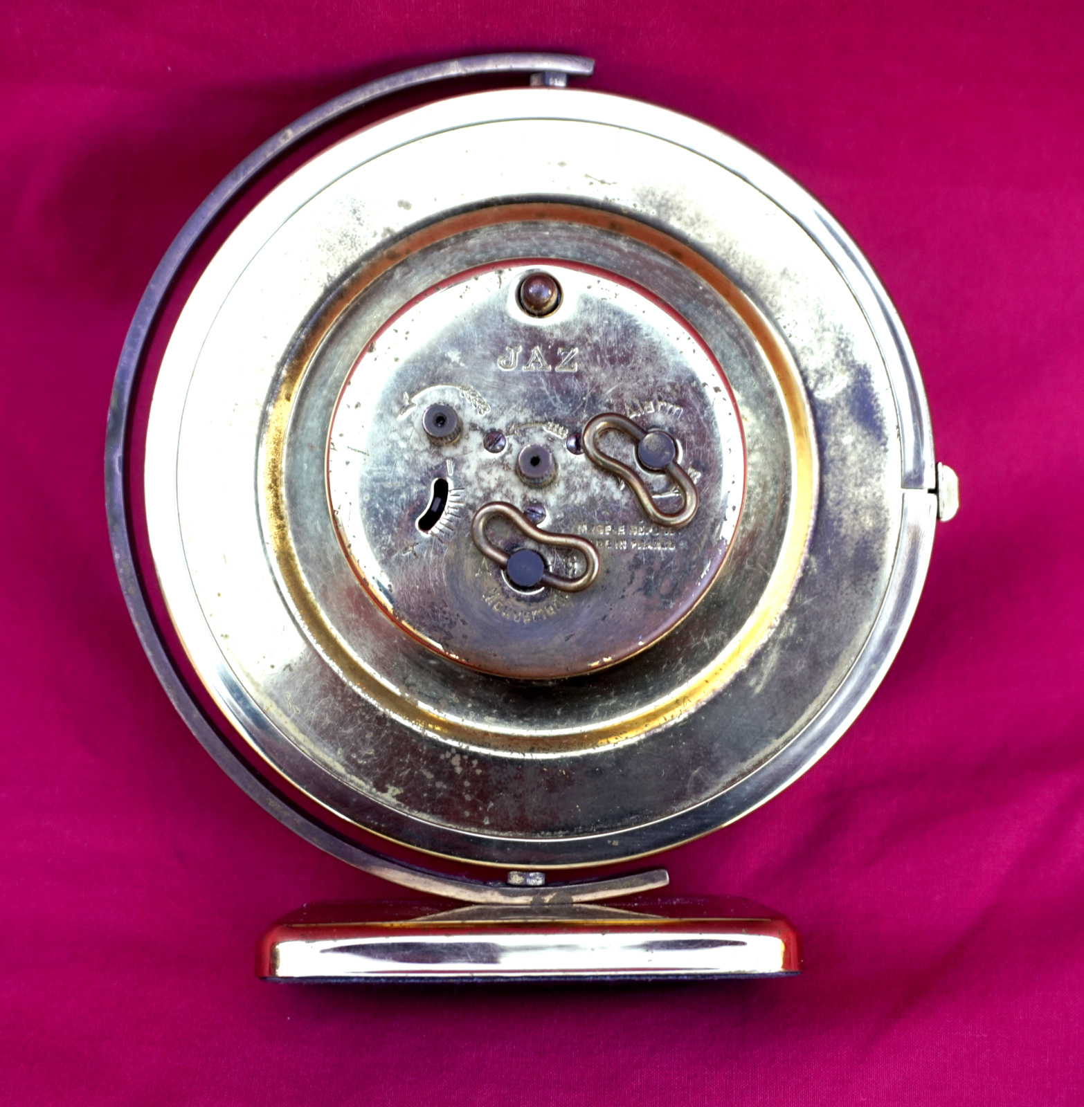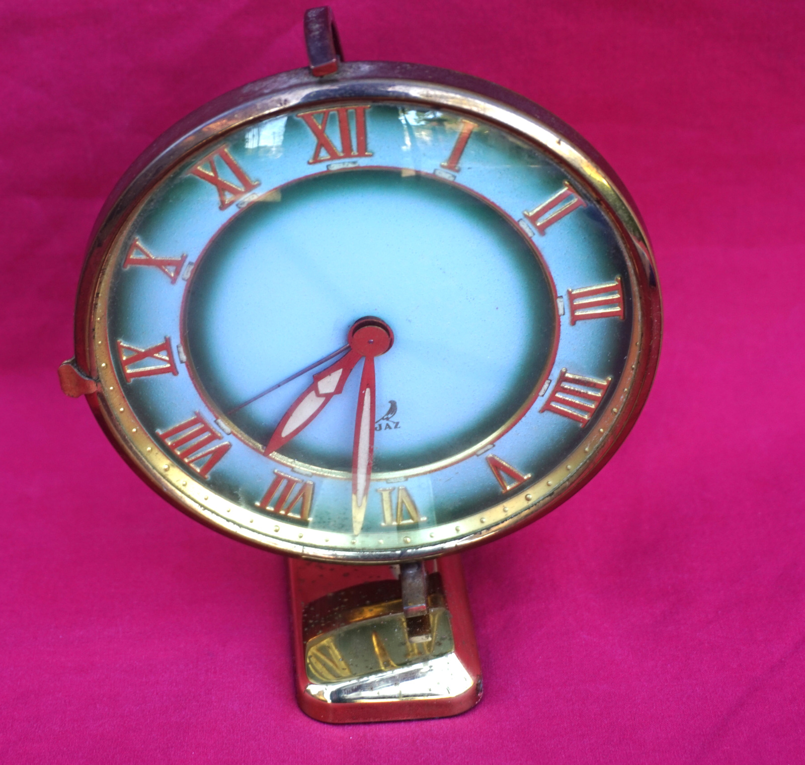 French rotating alarm clock with green dial and gilt roman numerals Tournic model made by Jaz during in 1956. Iyt has a mechanical 30 hours movement calibre J. 4 1/4" (11cm) diameter, 5 3/8" (13.7cm) height, weight 1.16 lb (530 grams). Good condition, it works.