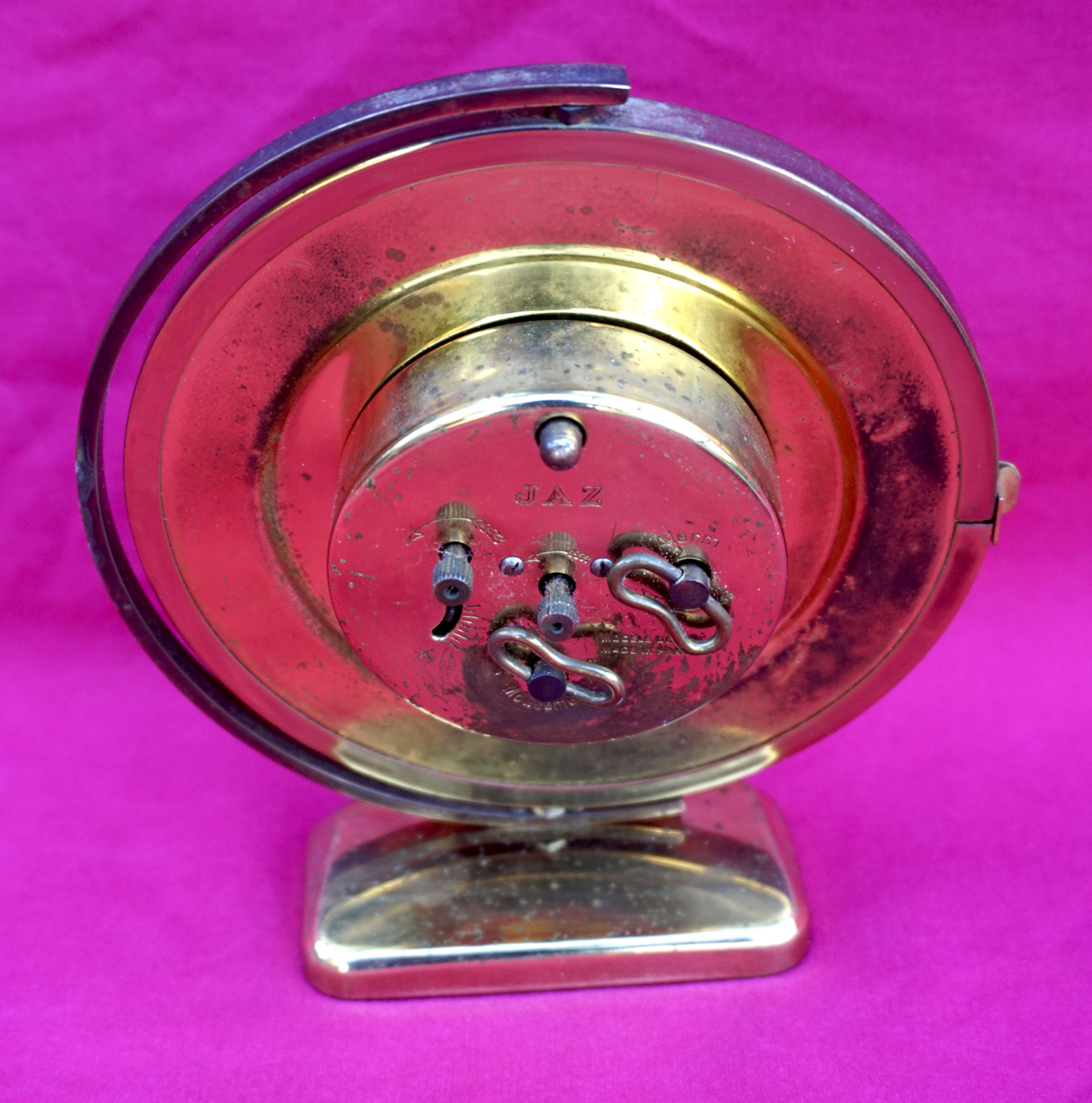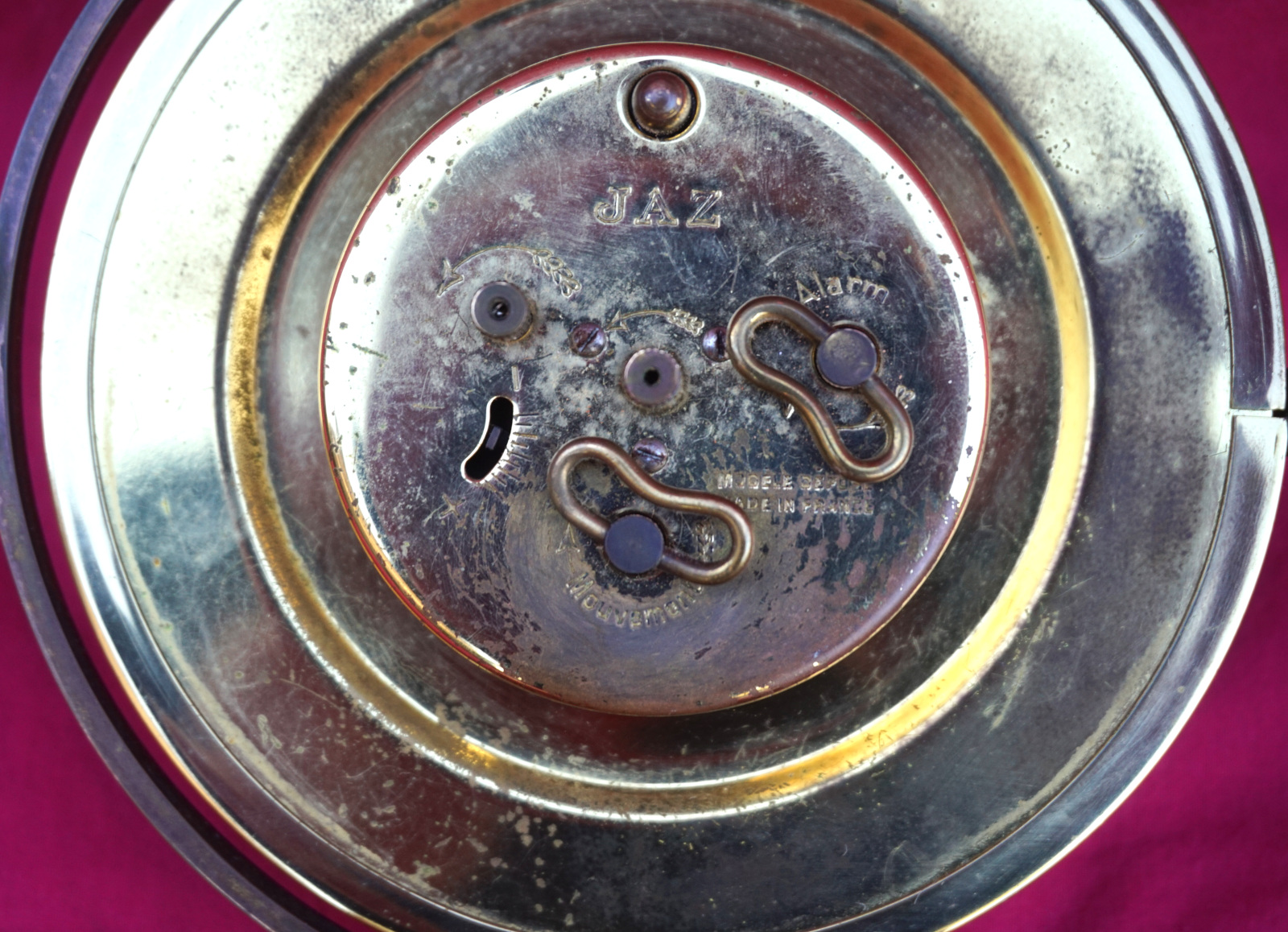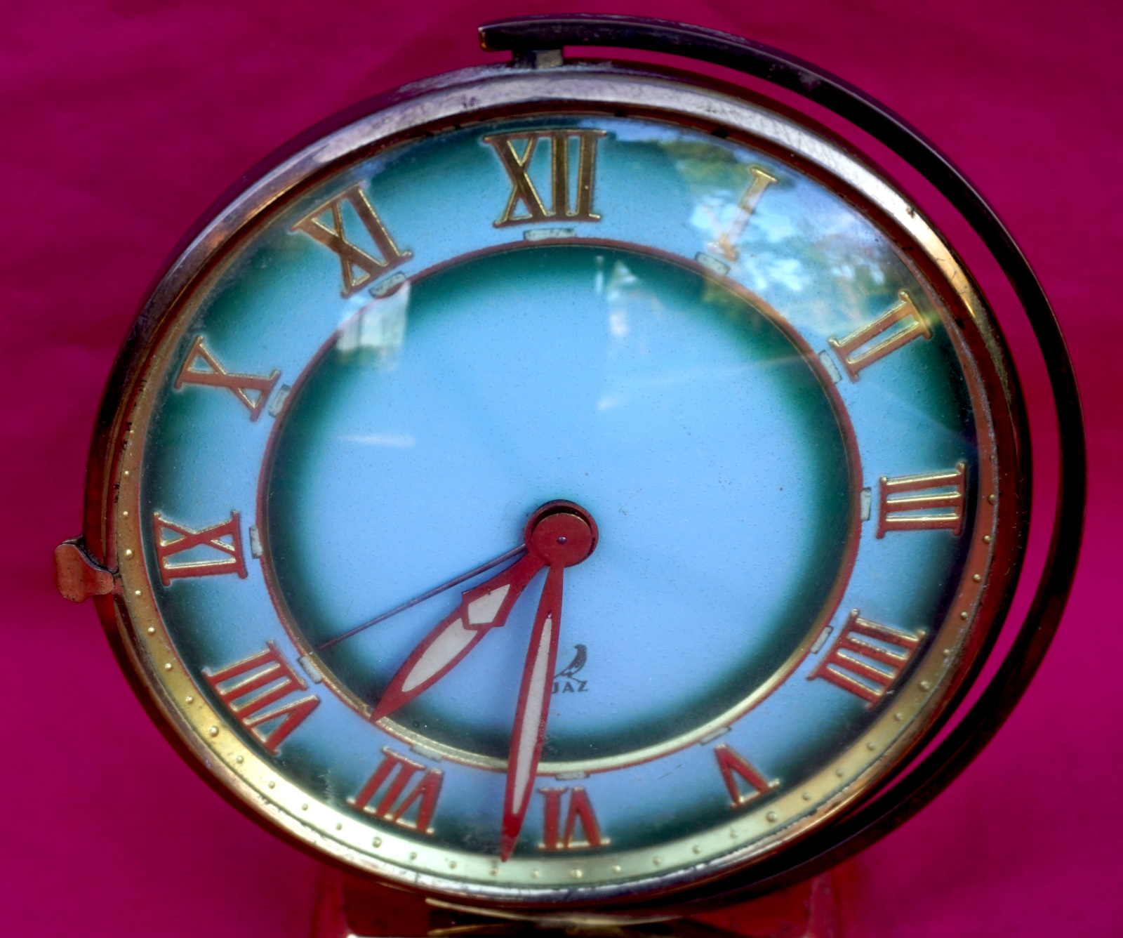 French rotating alarm clock with green dial and gilt roman numerals Tournic model made by Jaz during in 1956. Iyt has a mechanical 30 hours movement calibre J. 4 1/4" (11cm) diameter, 5 3/8" (13.7cm) height, weight 1.16 lb (530 grams). Good condition, it works.