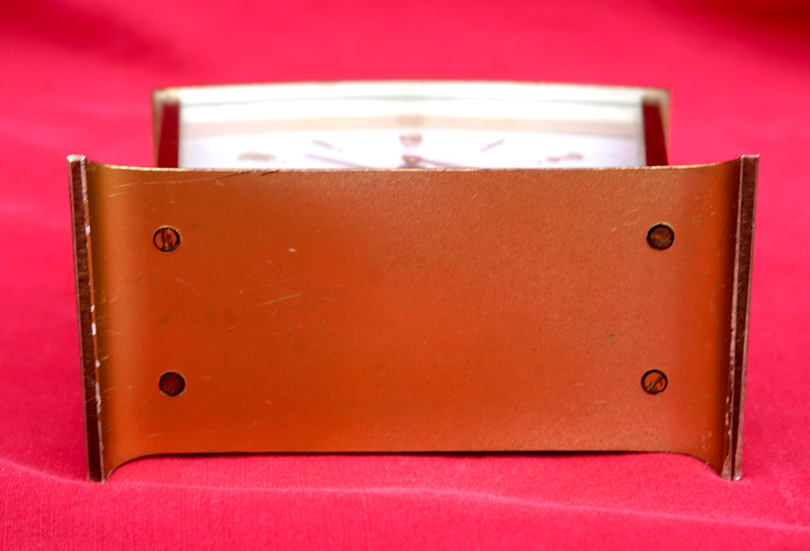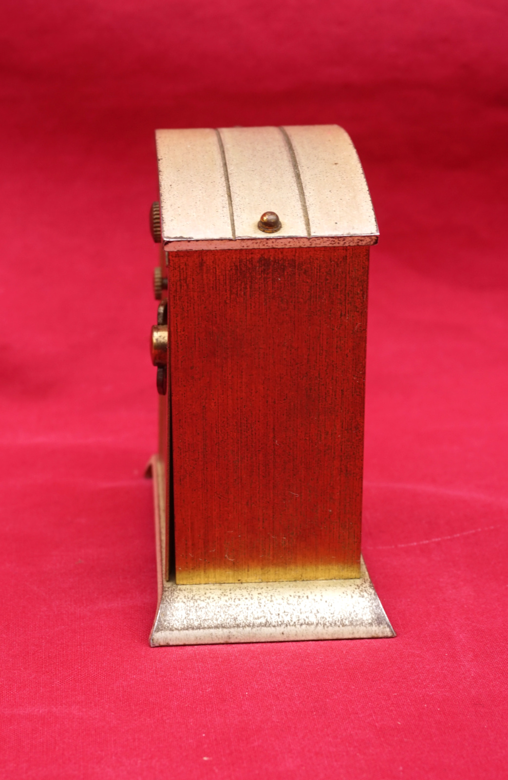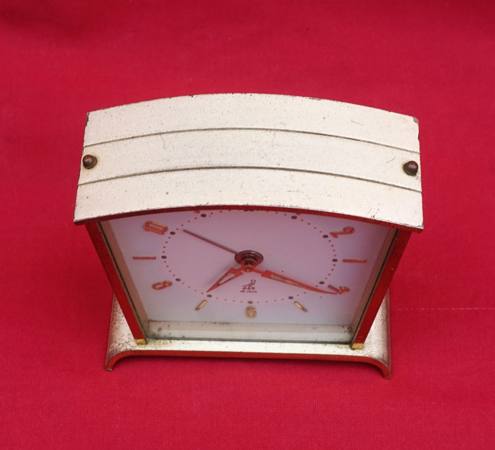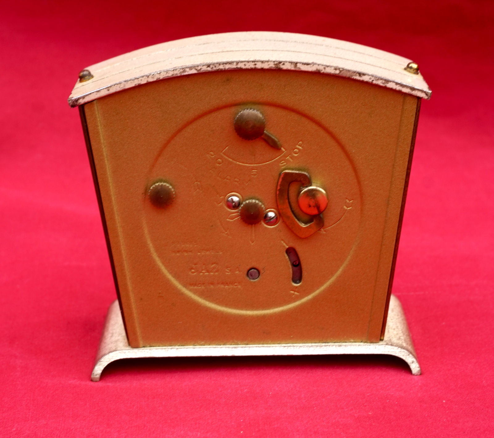French alarm clock model Voutic, new in the catalog 58/59 page1, made by Jaz France. The movement with 7 jewels and alarm adjustable. The case is in gold and silver plated. 3" (7.7cm) height, 3" (7.7cm) width, 1 1/2" (3.7cm) thickness. Beautiful condition, it works.