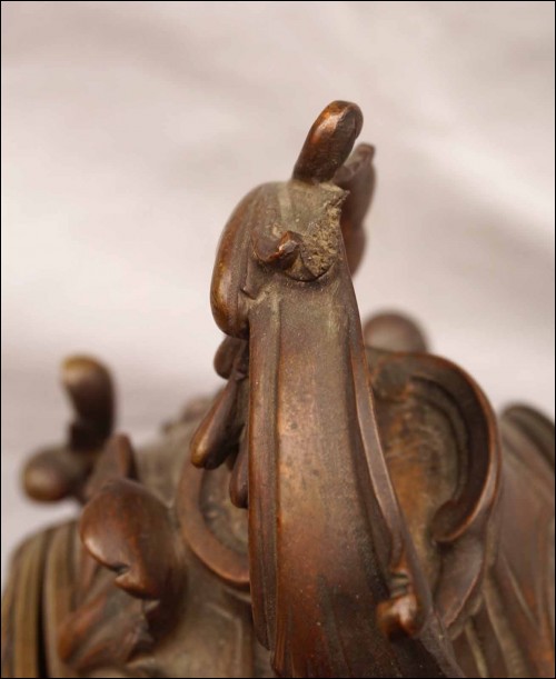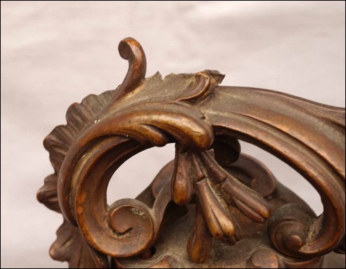 Pendule de cheminée en bronze de style Louis XV , avec une mouvement de Paris, fin XIX° siècle. Elle est signée HB. Hauteur 46cm, largeur 33cm, profondeur 19cm, poids 11,09kg. Le mouvement fonctionne, il sonne les heures et les demis. Manque de feuillage sur le décor du dessus.