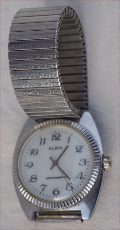 Vintage men mechanical antimagnetic wristwatch made by Albin during the 1970's. On the back is engraved " Stainless Steel Back Dustproof Made in China". 1 3/8" (3.4cm) diameter. The movement works, good condition as shown by the following pictures.