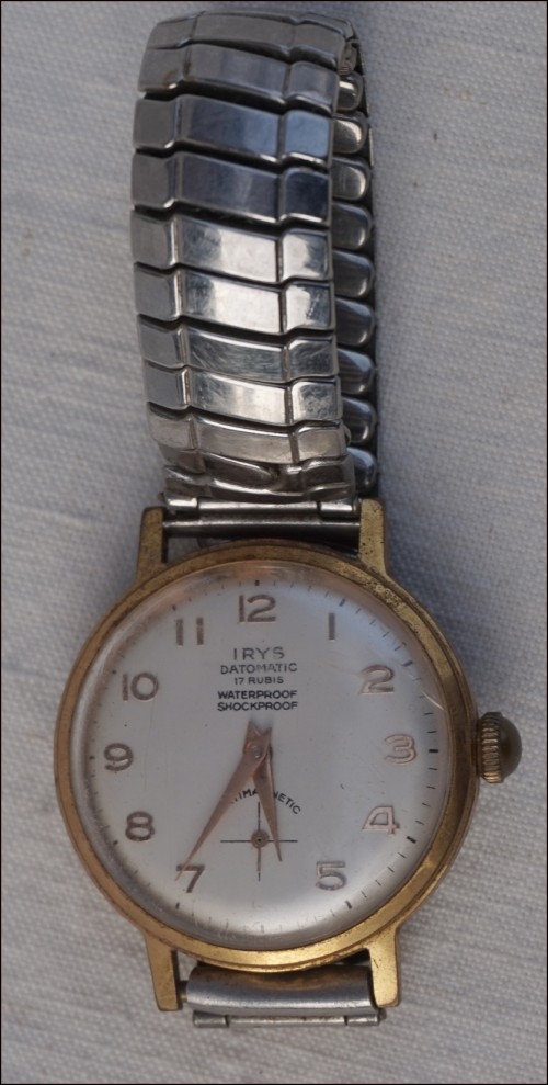 Vintage men 17 jewels datomatic waterproof shockproof and antimacnetic wristwatch made by IRYS during the 1960's. On the back is engraved "Stainless Steel Back Antimagnetic". 1 5/8" (3.4cm) diameter. The movement works and stops, the acrylic glass has an hairline and some scratches as shown by the following pictures.